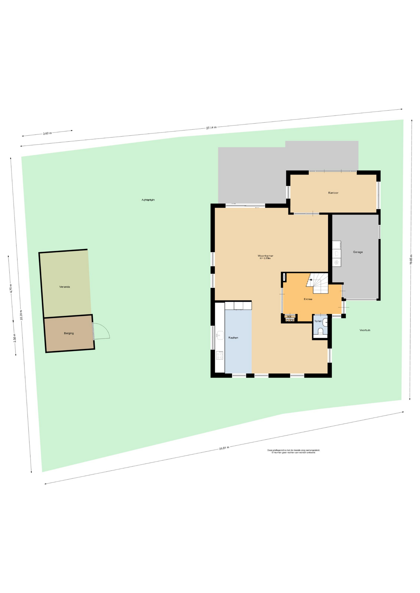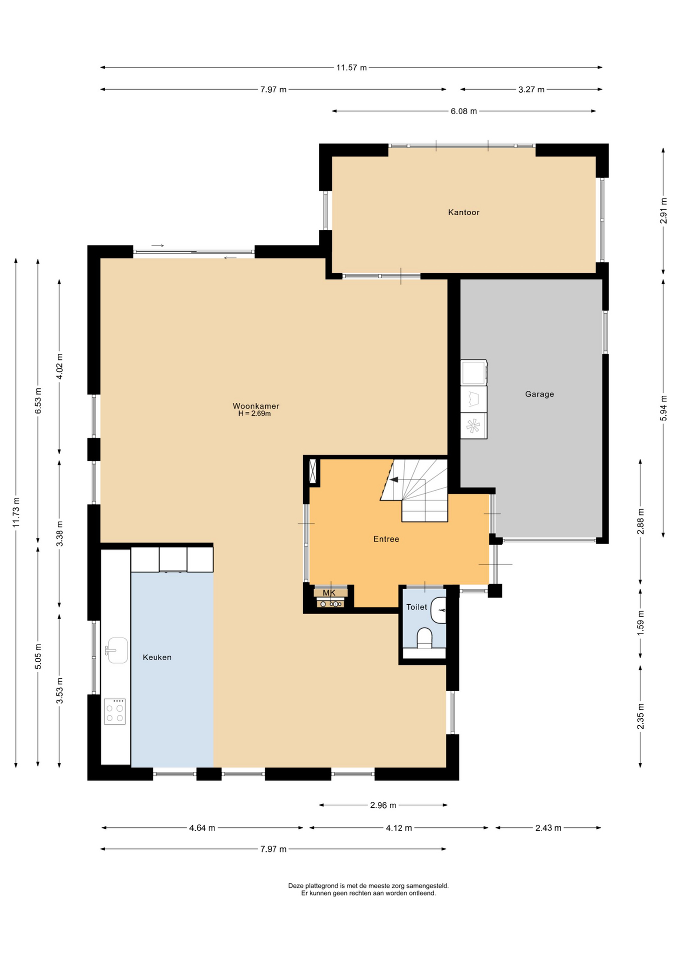 Begane grond: Ruime entree, meterkast, toilet, doorgang naar de garage, woonkamer met open woonkeuken, werkkamer.
