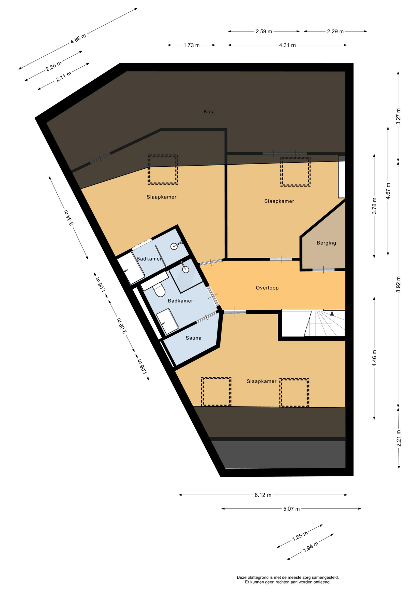 Op de verdieping bevinden zich maar liefst 3 (slaap)kamers waarvan 1 met airco, 2 badkamers en veel bergruimte. Alle kamers zijn voorzien van dakramen en 1 slaapkamer heeft een badkamer-en-suite voorzien van wastafelmeubel en douchehoek. De andere badkamer is ruimer en beschikt over een douchehoek, wastafelmeubel, toilet en sauna. Deze verdieping leent zich perfect voor gasten en alsnog blijft er een (slaap)kamer over die kan worden ingericht als kantoor of hobbyruimte.