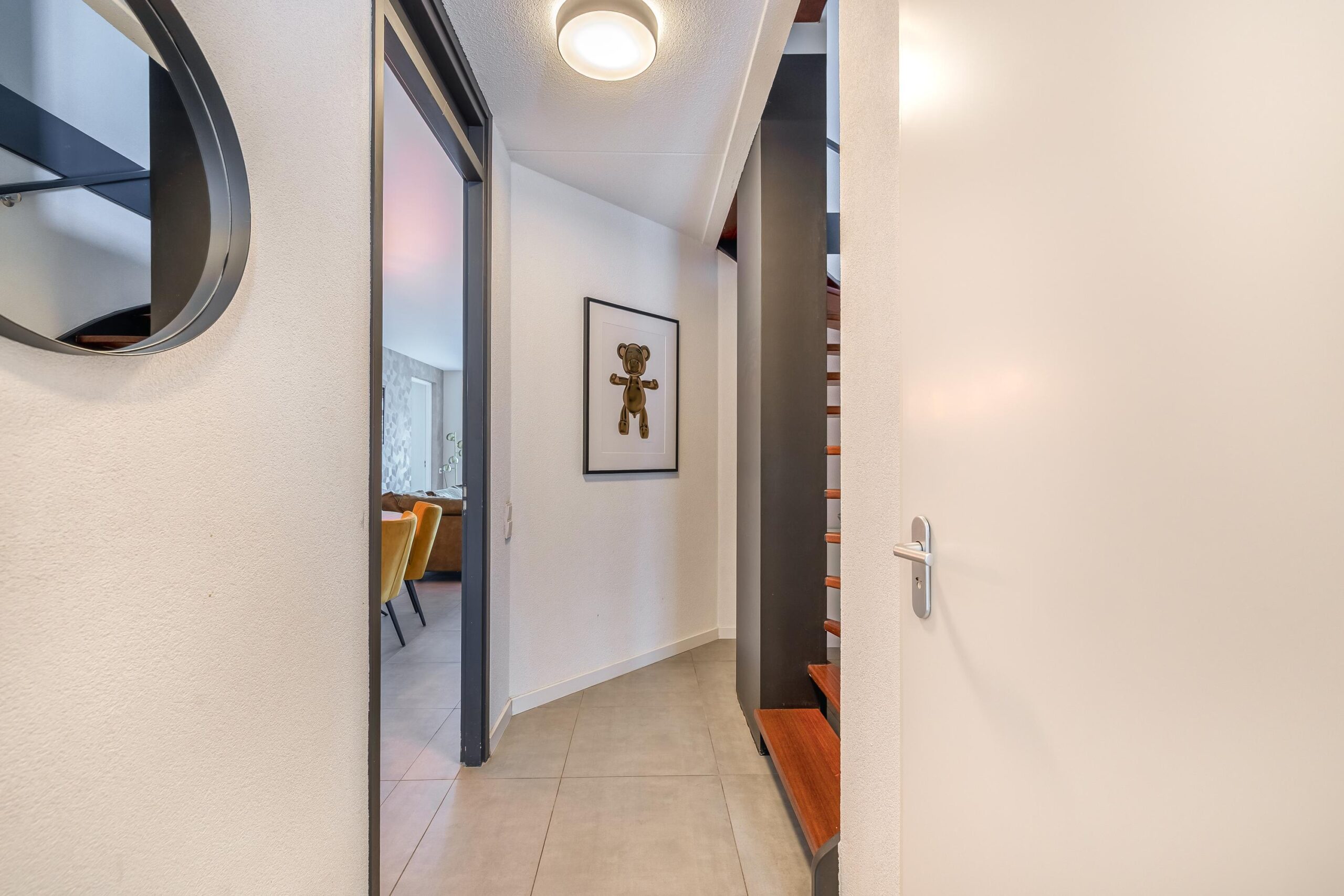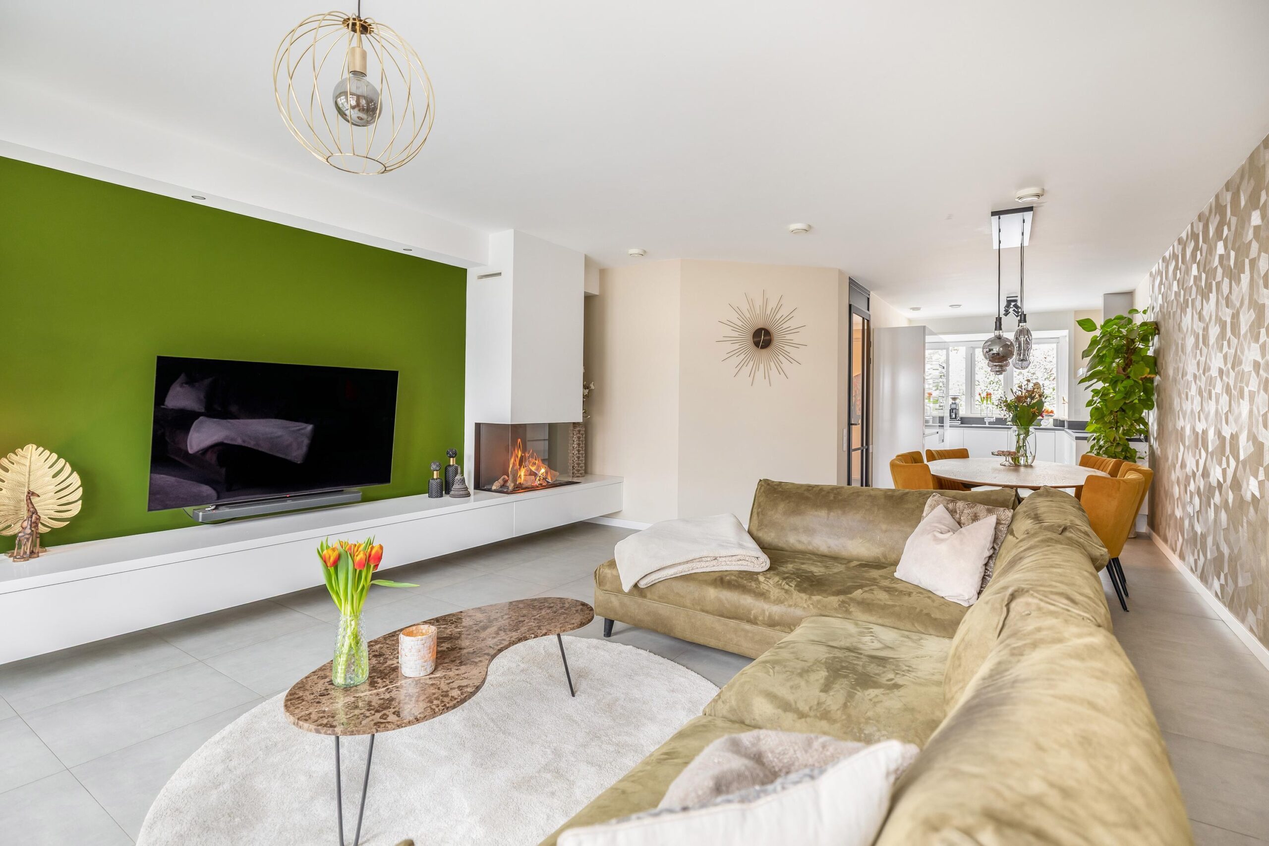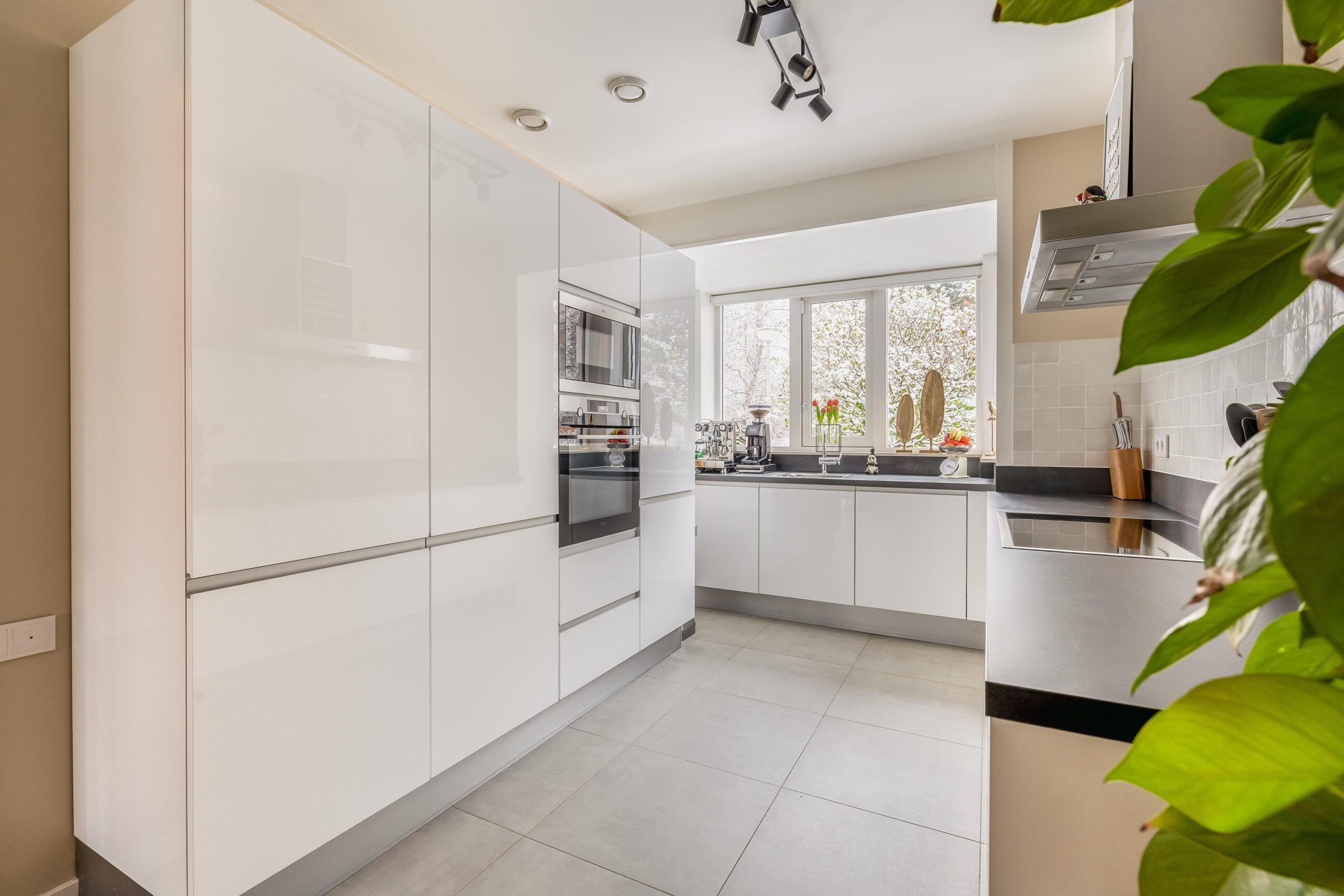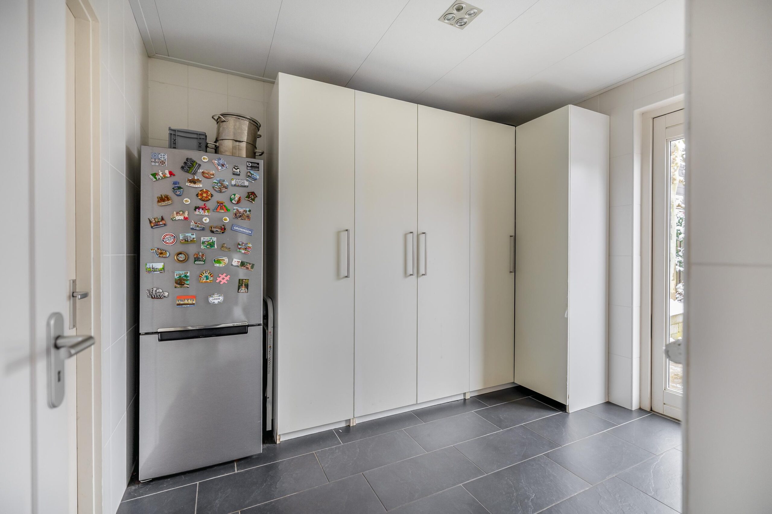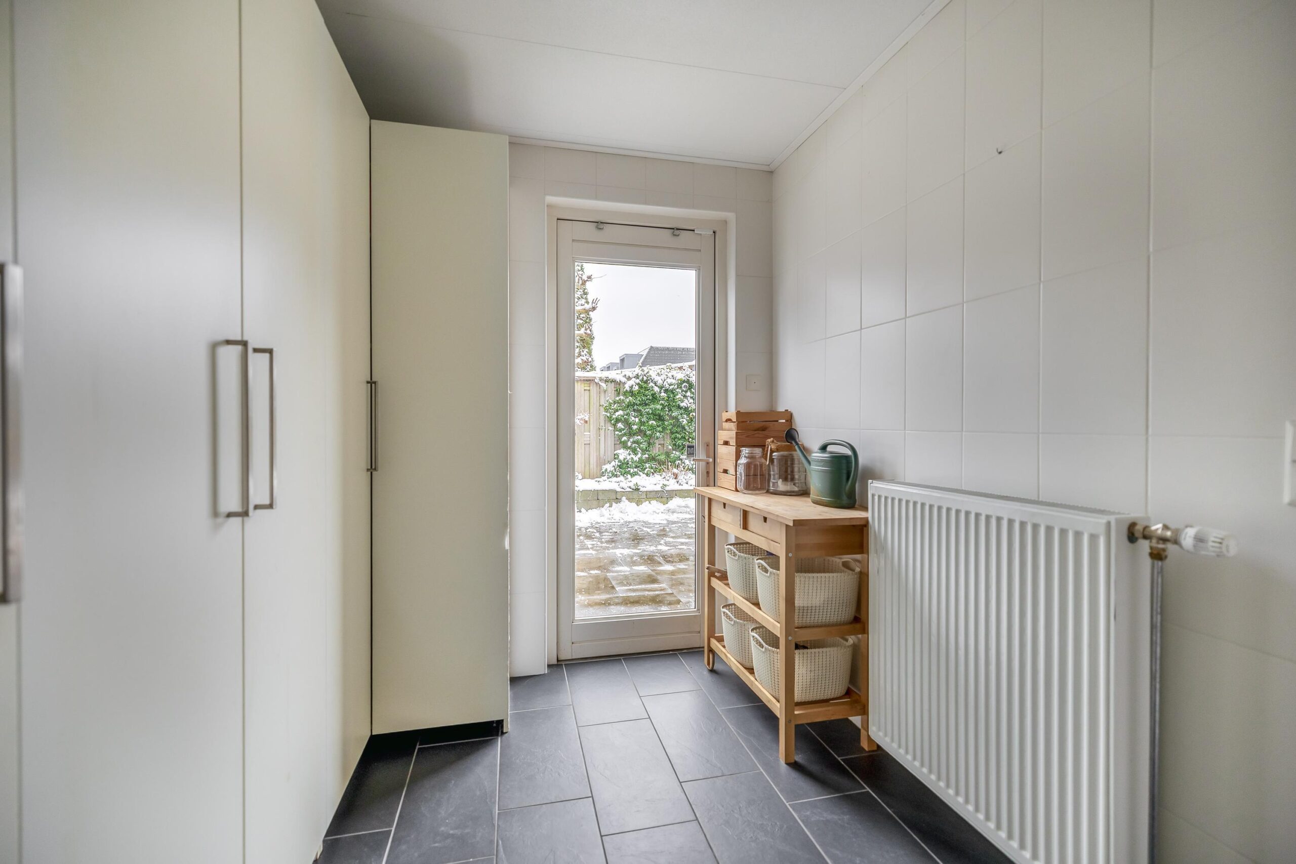 De begane grond is afgewerkt met strakke wanden en plafonds, een moderne plavuizenvloer én vloerverwarming, wat zorgt voor extra comfort. De sfeervolle gashaard, verwerkt in een op maat gemaakte meubelkast, maakt het plaatje compleet. Aangrenzend vind je de praktische bijkeuken, ideaal als extra bergruimte en met een doorloop naar de garage.