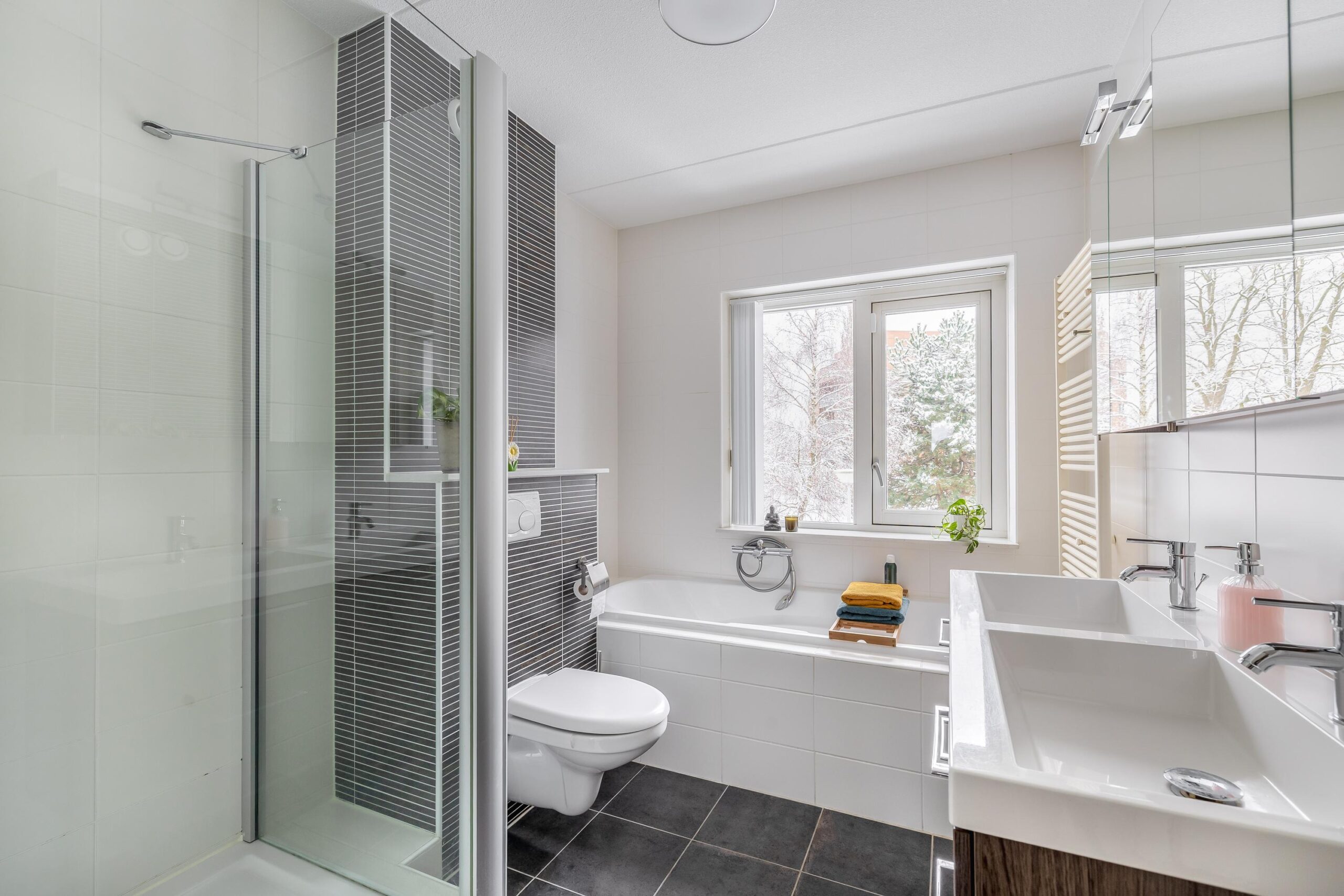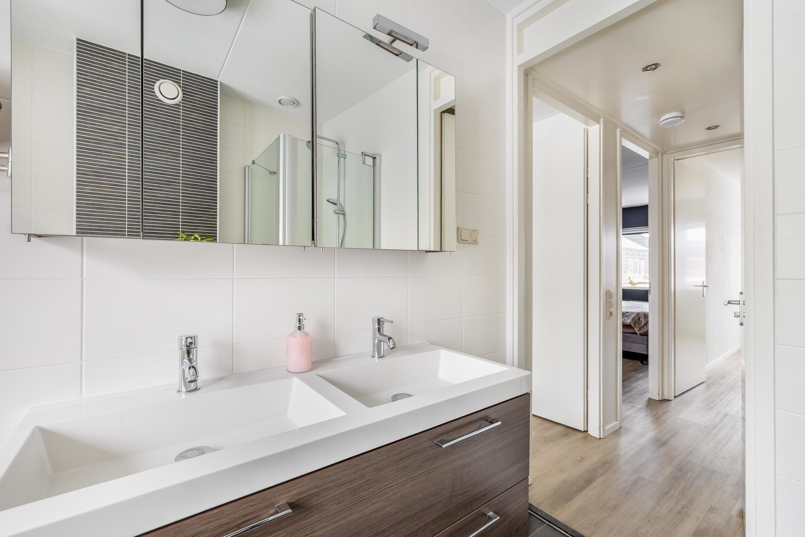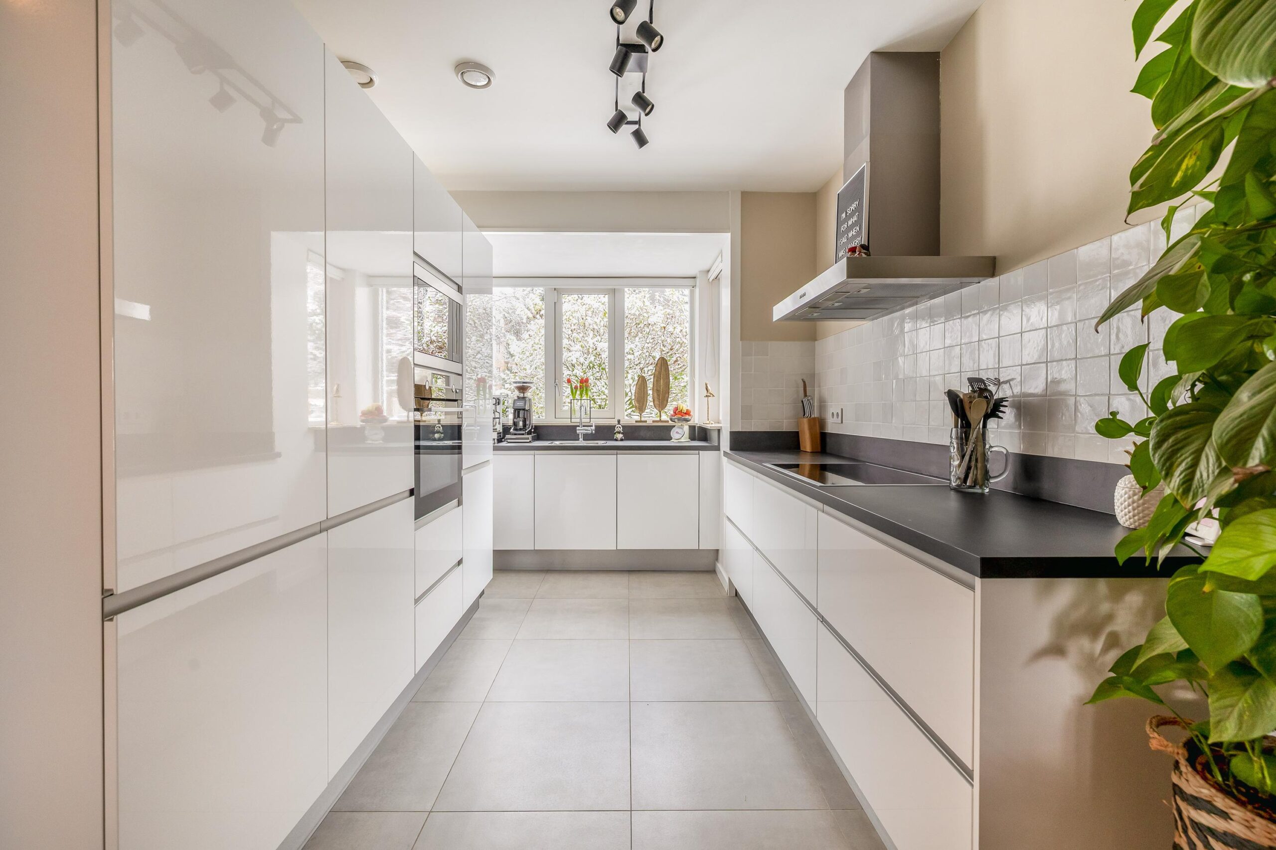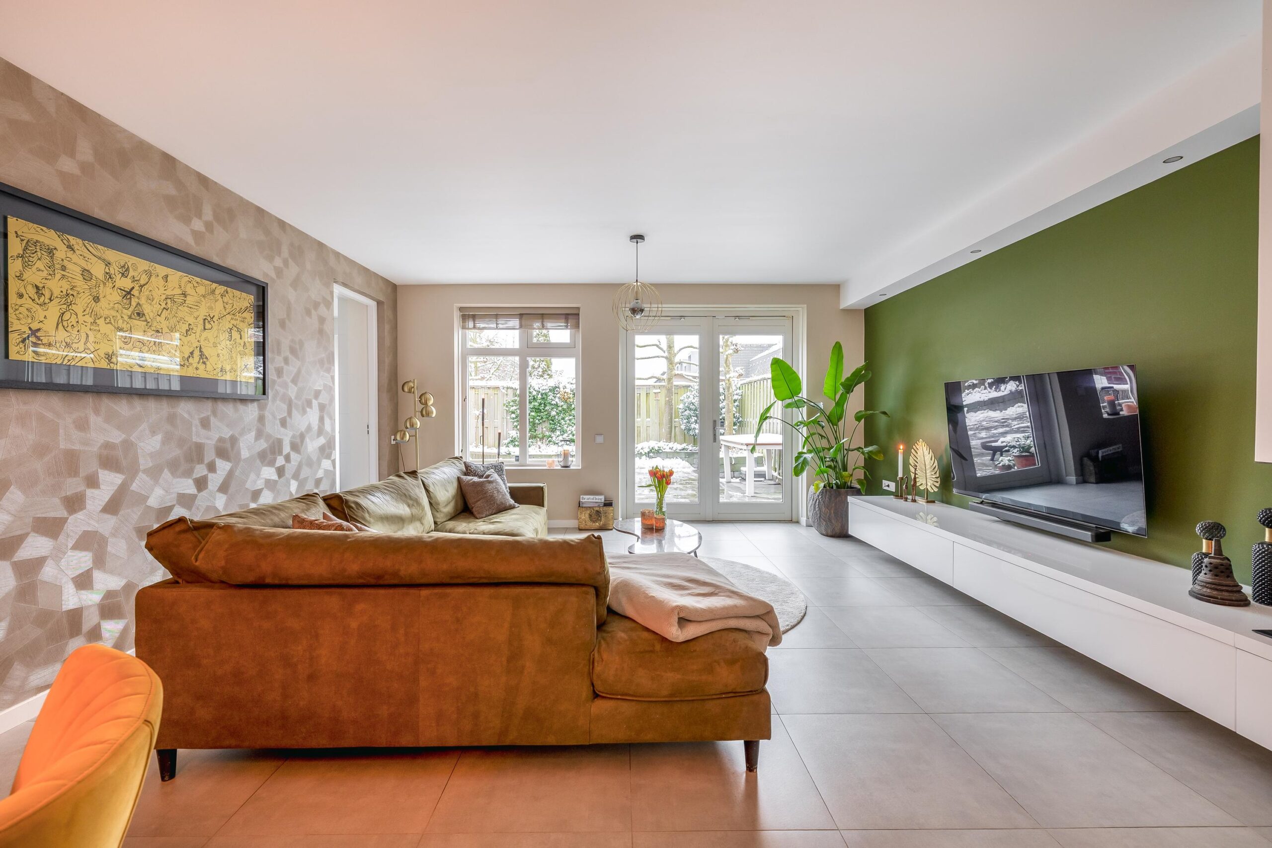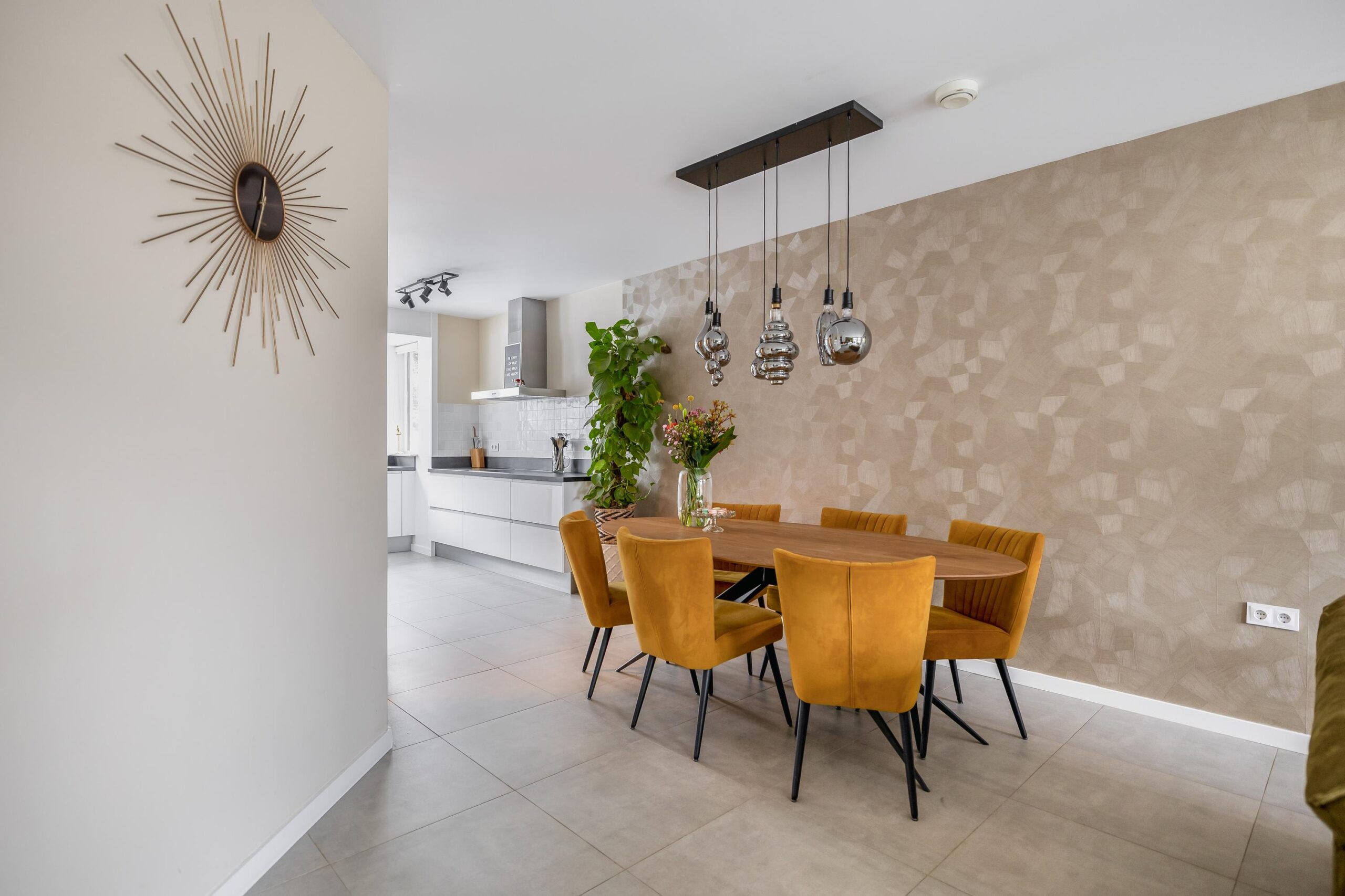De begane grond is afgewerkt met strakke wanden en plafonds, een moderne plavuizenvloer én vloerverwarming, wat zorgt voor extra comfort. De sfeervolle gashaard, verwerkt in een op maat gemaakte meubelkast, maakt het plaatje compleet. Aangrenzend vind je de praktische bijkeuken, ideaal als extra bergruimte en met een doorloop naar de garage.