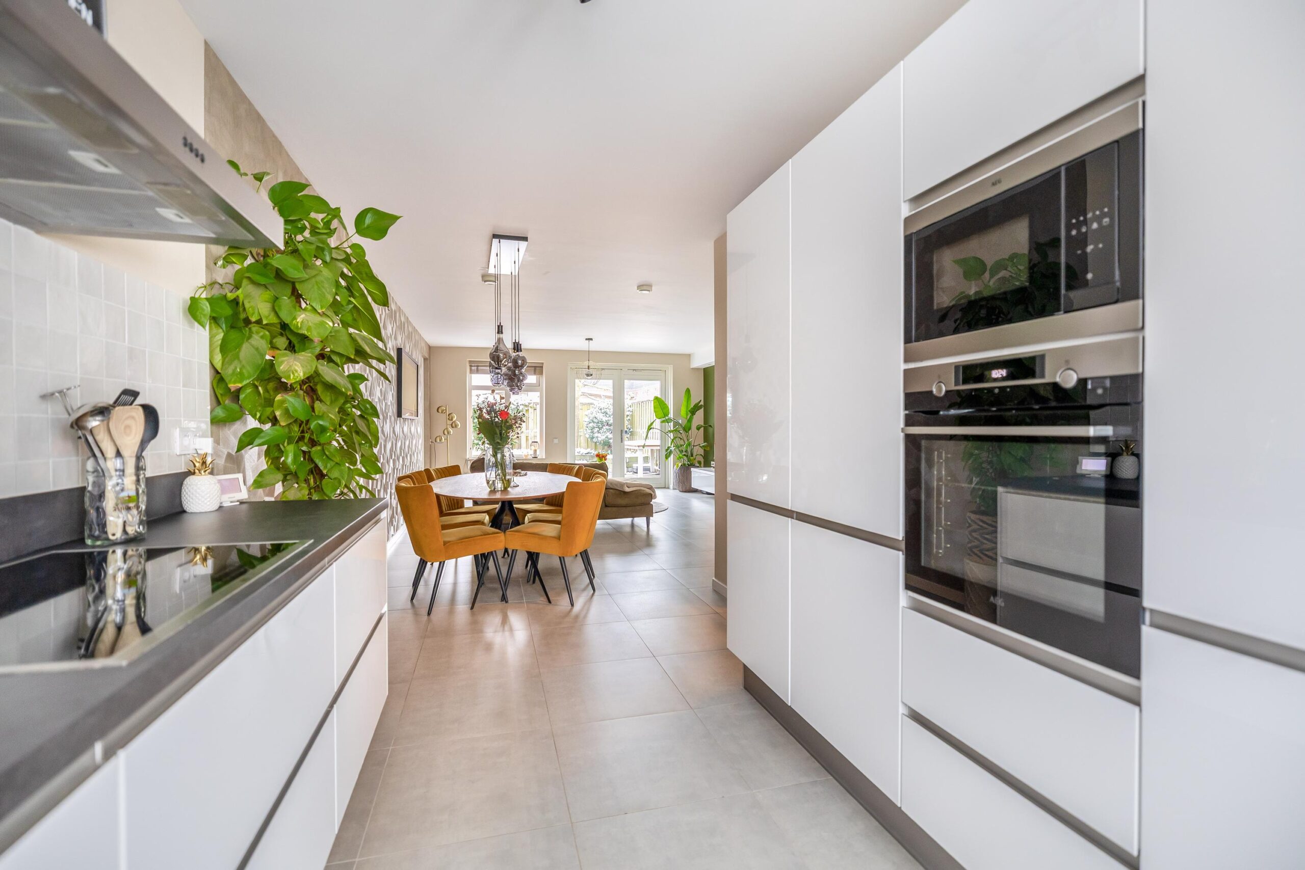 Bij binnenkomst ervaar je direct het gevoel van thuiskomen. De entree biedt toegang tot het moderne toilet in eigentijdse kleurstelling. Aan de voorzijde bevindt zich de strakke, hoogglans witte open keuken, voorzien van veel kastruimte en diverse inbouwapparatuur. Dankzij de uitbouw aan de achterzijde is een royale leefruimte ontstaan waar moeiteloos een grote eettafel en comfortabele zithoek passen. Grote raampartijen en openslaande deuren zorgen voor een prachtige lichtinval en een fijne verbinding met de tuin.