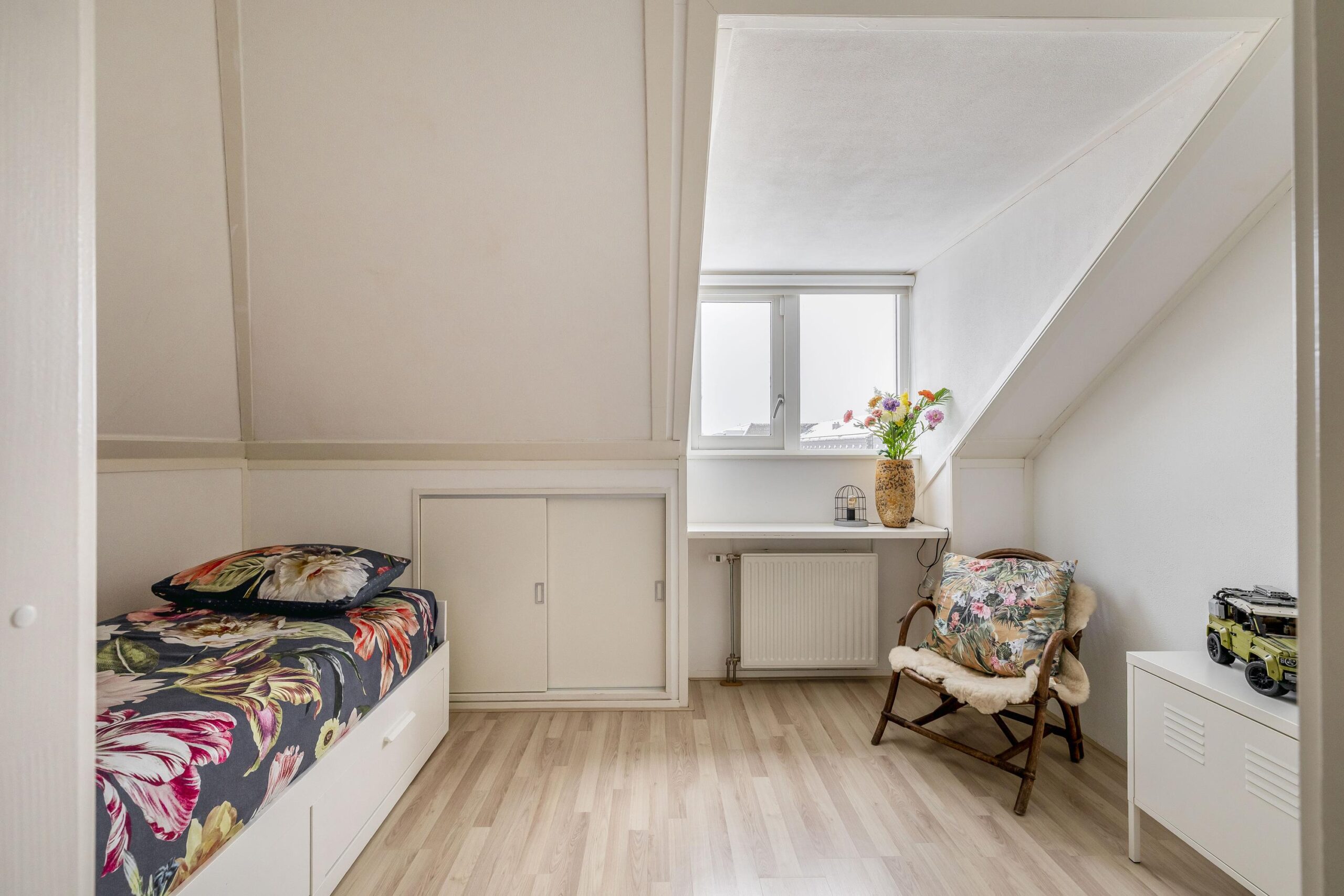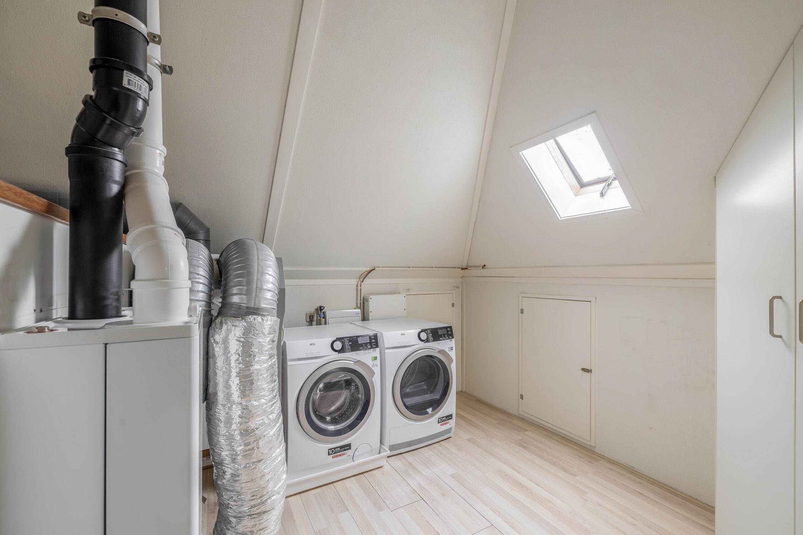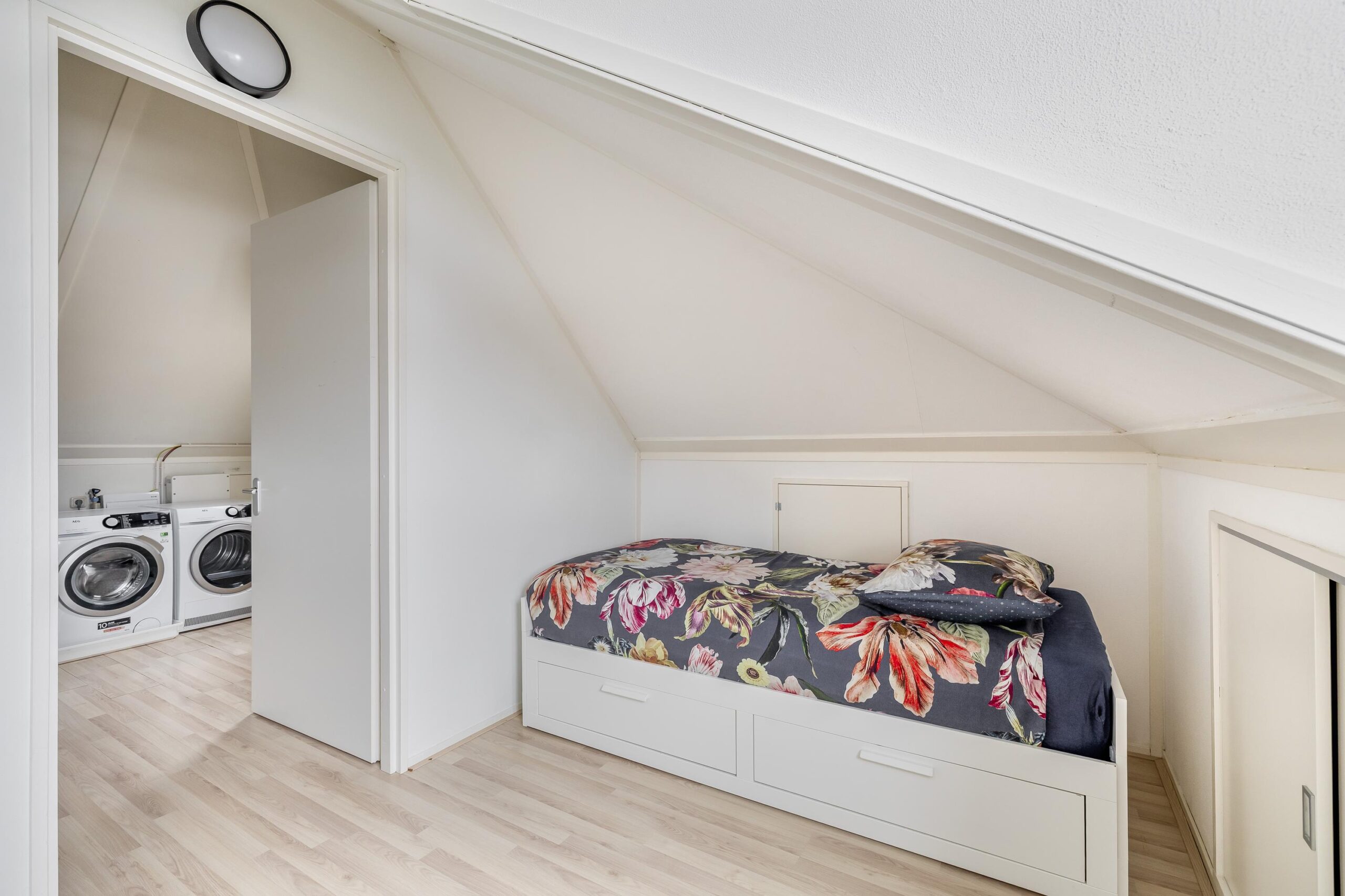 De 2e verdieping biedt een volwaardige 4e slaapkamer met dakkapel en veel bergruimte achter de knieschotten over de gehele zolder. Op de voorzolder bevinden zich de aansluitingen voor wasmachine en droger.