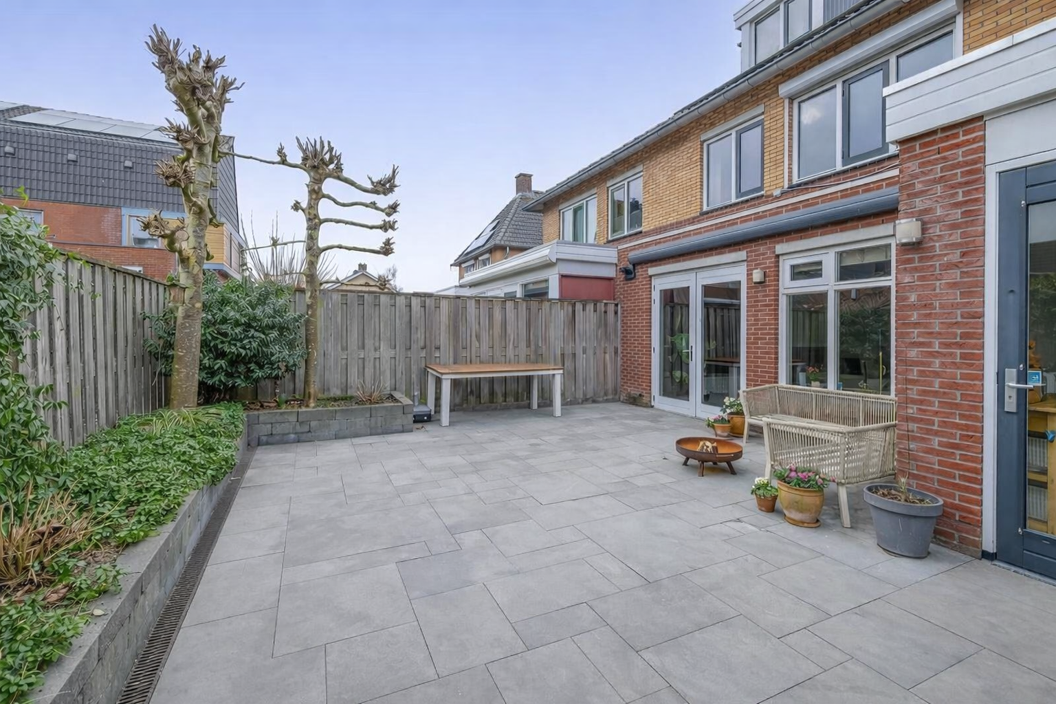 De zonnige achtertuin op het zuiden meet circa 8,75 x 7,00 meter en biedt volop privacy dankzij de leiplatanen die iedere zomer veel groen en beschutting bieden. Een heerlijke plek om tot rust te komen onder het op maat gemaakte zonnescherm. De voortuin is speels en praktisch aangelegd en biedt ruimte om 2 auto’s op eigen oprit te parkeren. Daarnaast is er voldoende openbare parkeergelegenheid in de straat.