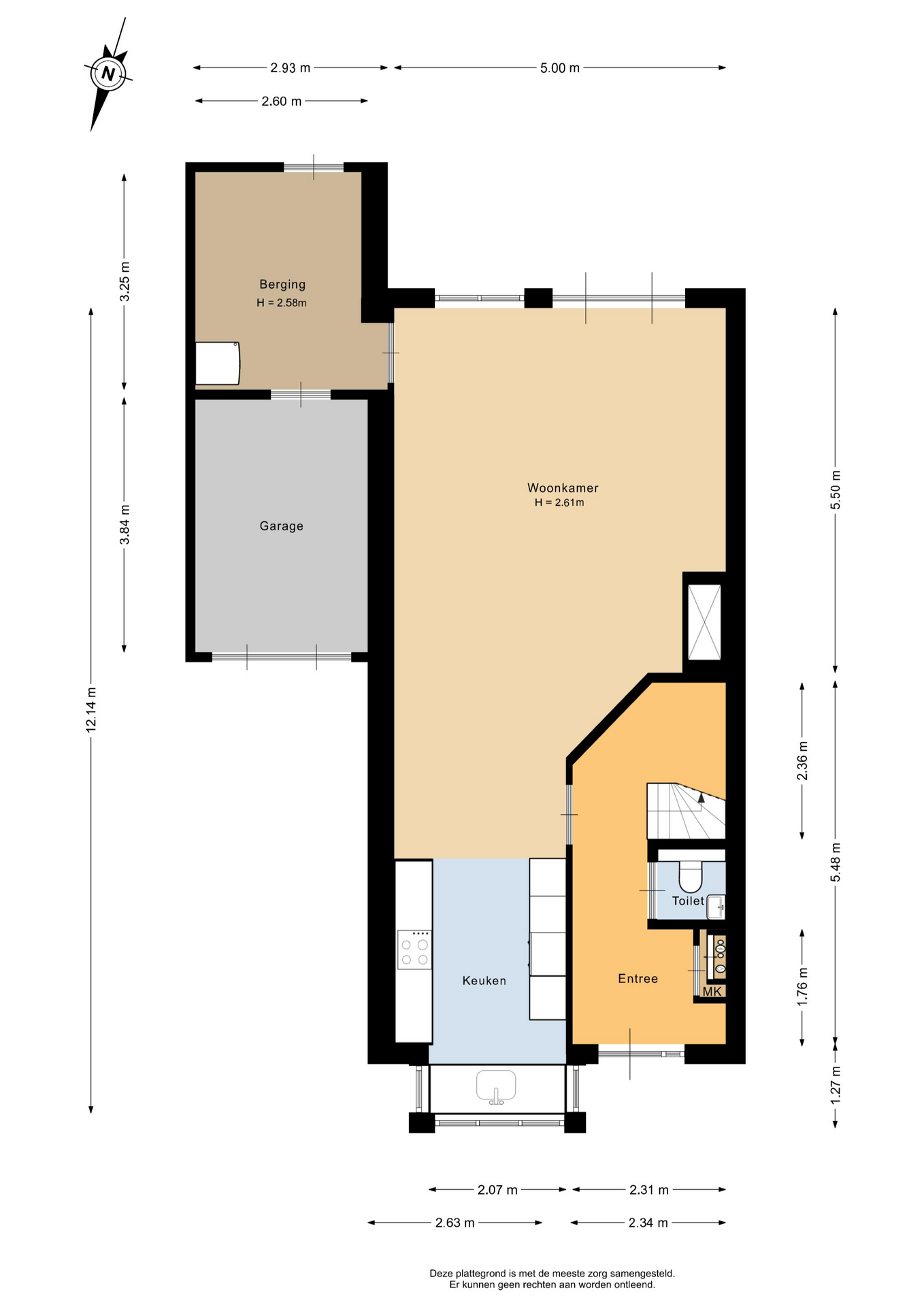 Begane grond: Entree, meterkast, toilet, open keuken, woonkamer, bijkeuken, garage.