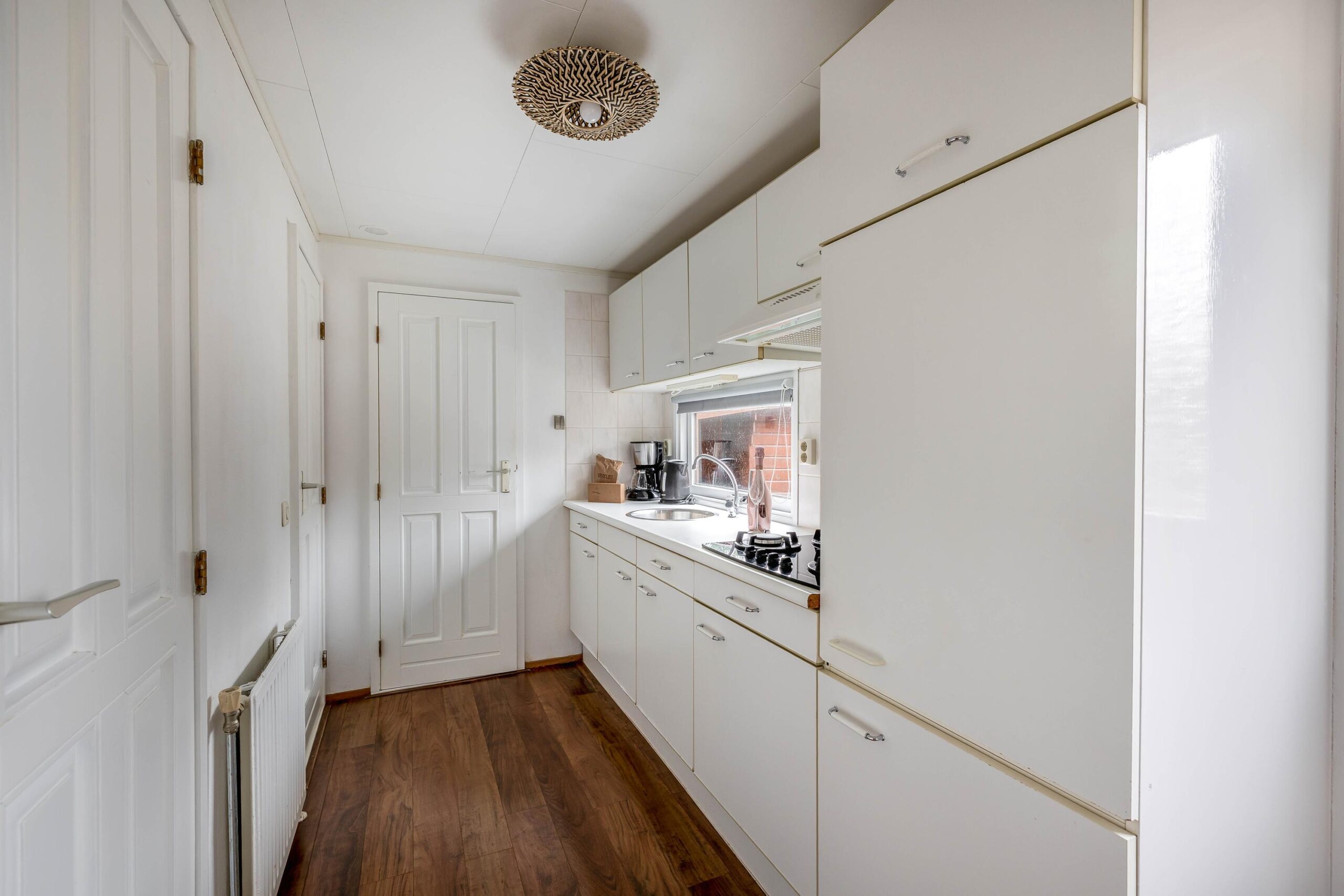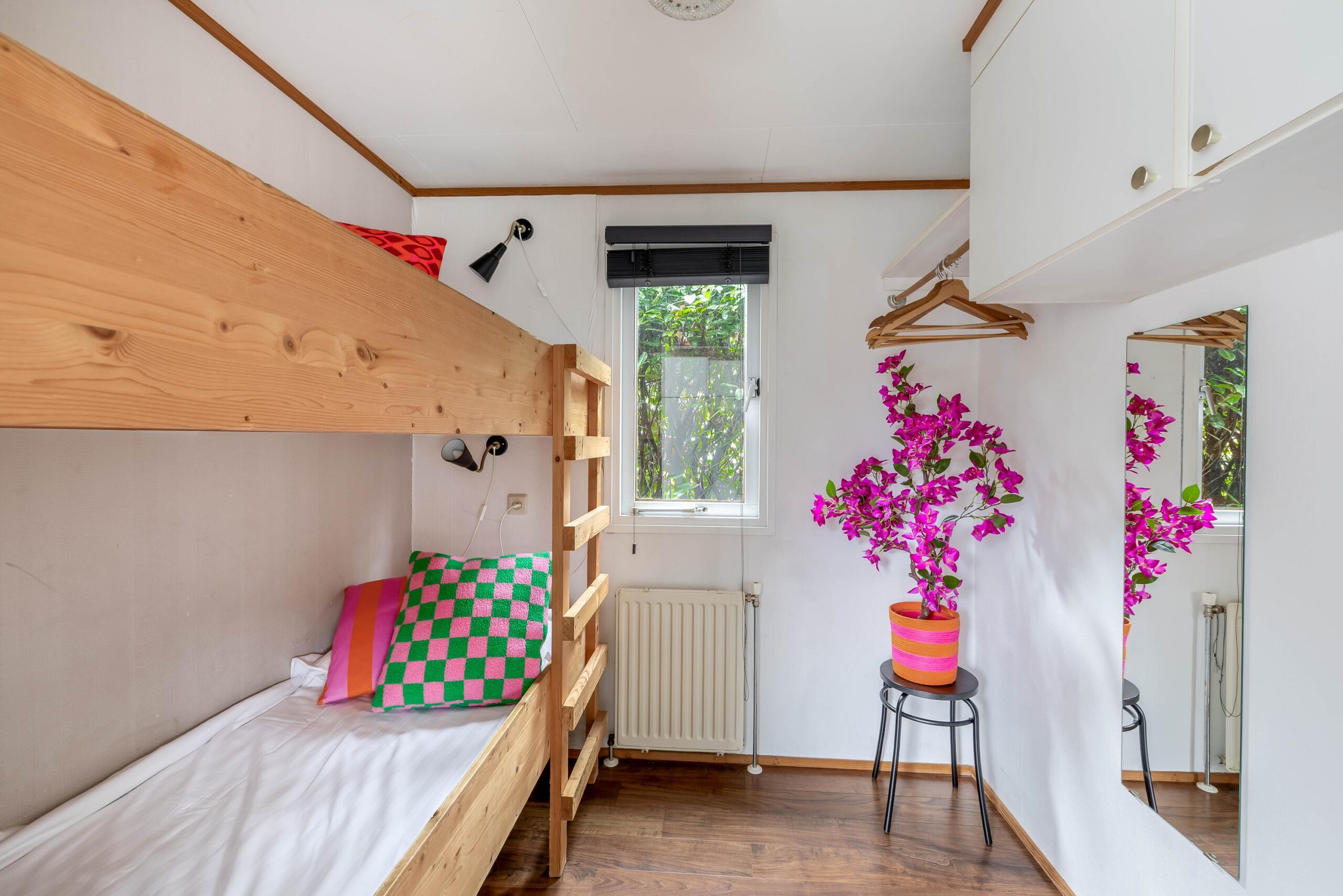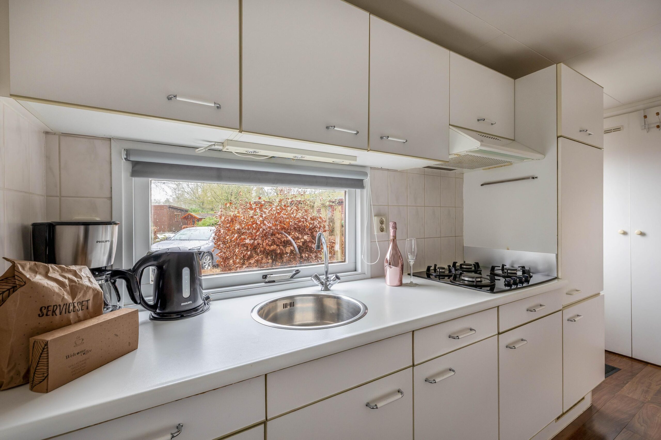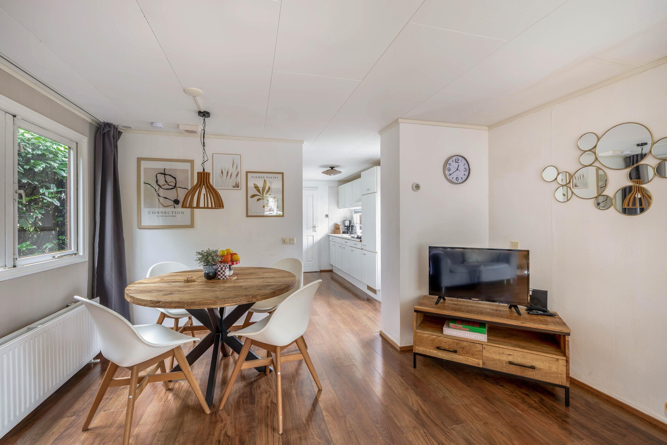 Met een woonoppervlakte van 46 m² en een inhoud van 164 m³ biedt deze chalet een comfortabele indeling. De lichte woonkamer heeft grote raampartijen en biedt ruimte voor zowel een zit- als eetgedeelte. De keuken is uitgerust met een gaskookplaat, ingebouwde afzuigkap en koelkast. Daarnaast zijn een koffiezetapparaat, waterkoker en een combimagnetron op het aanrecht aanwezig, zodat de keuken direct gebruiksklaar is voor dagelijks comfort. De badkamer (2019) is eveneens vernieuwd en uitgerust met een douche, wastafelmeubel en toilet. Verwarming vindt plaats via een Remeha Avanta 28C CW4 cv ketel (2008) met radiatoren.
