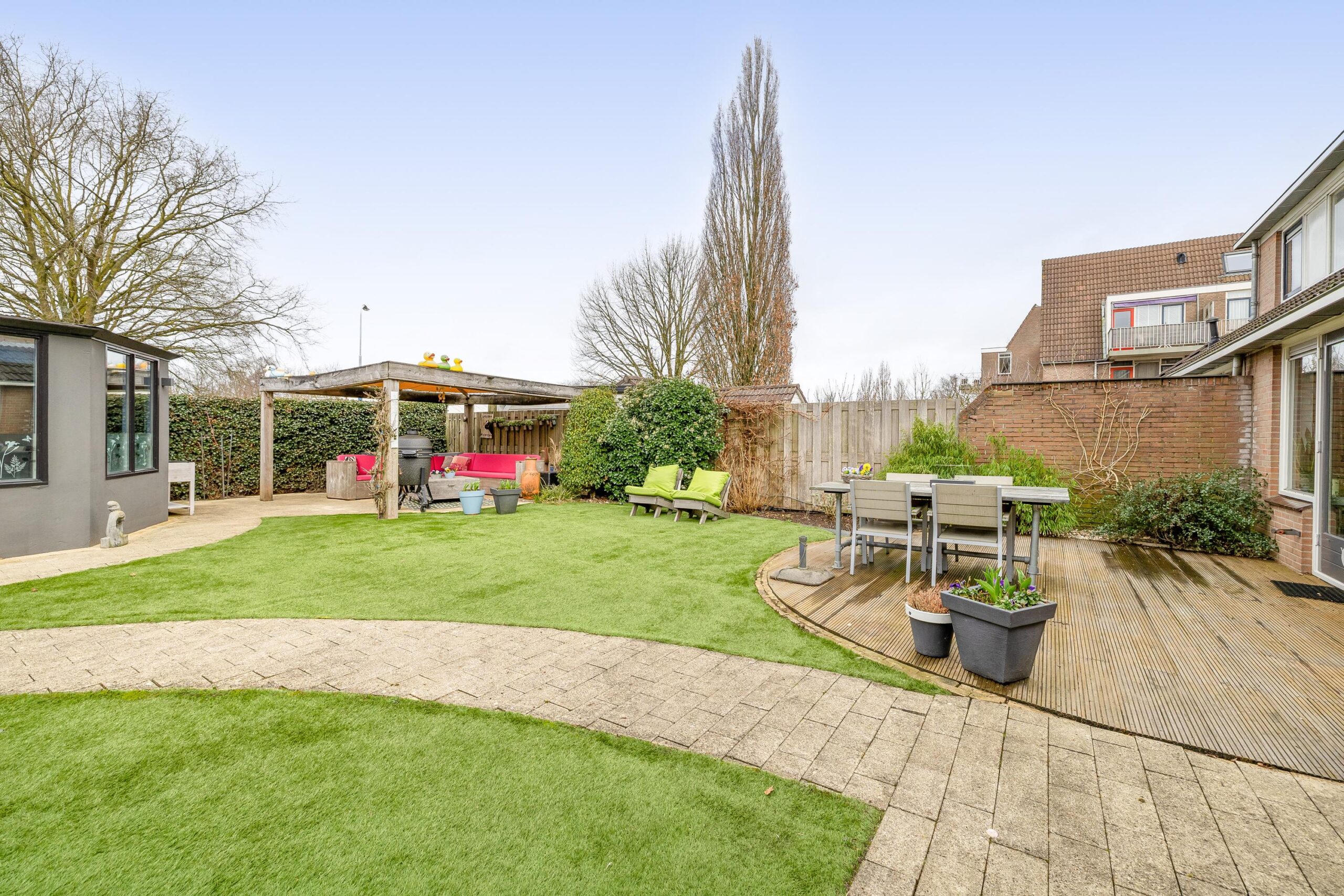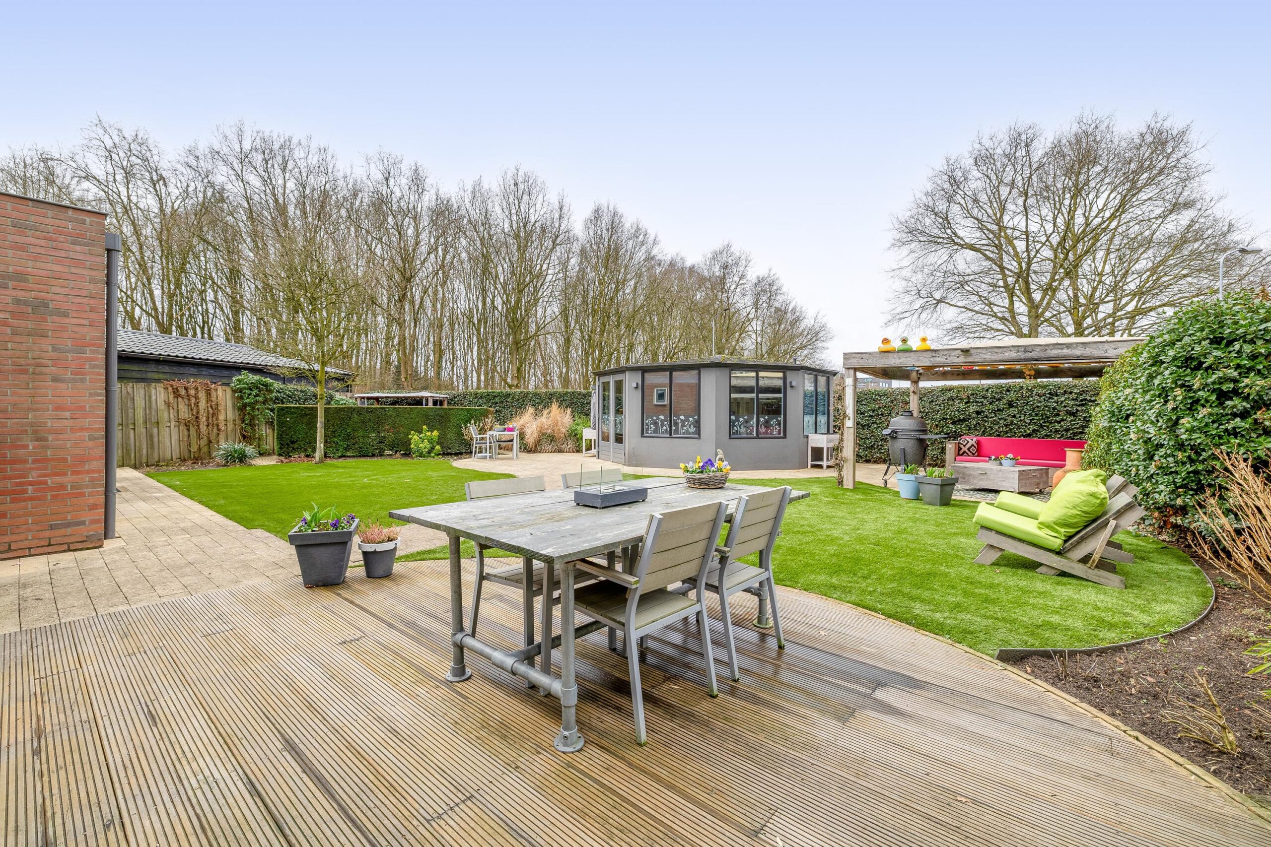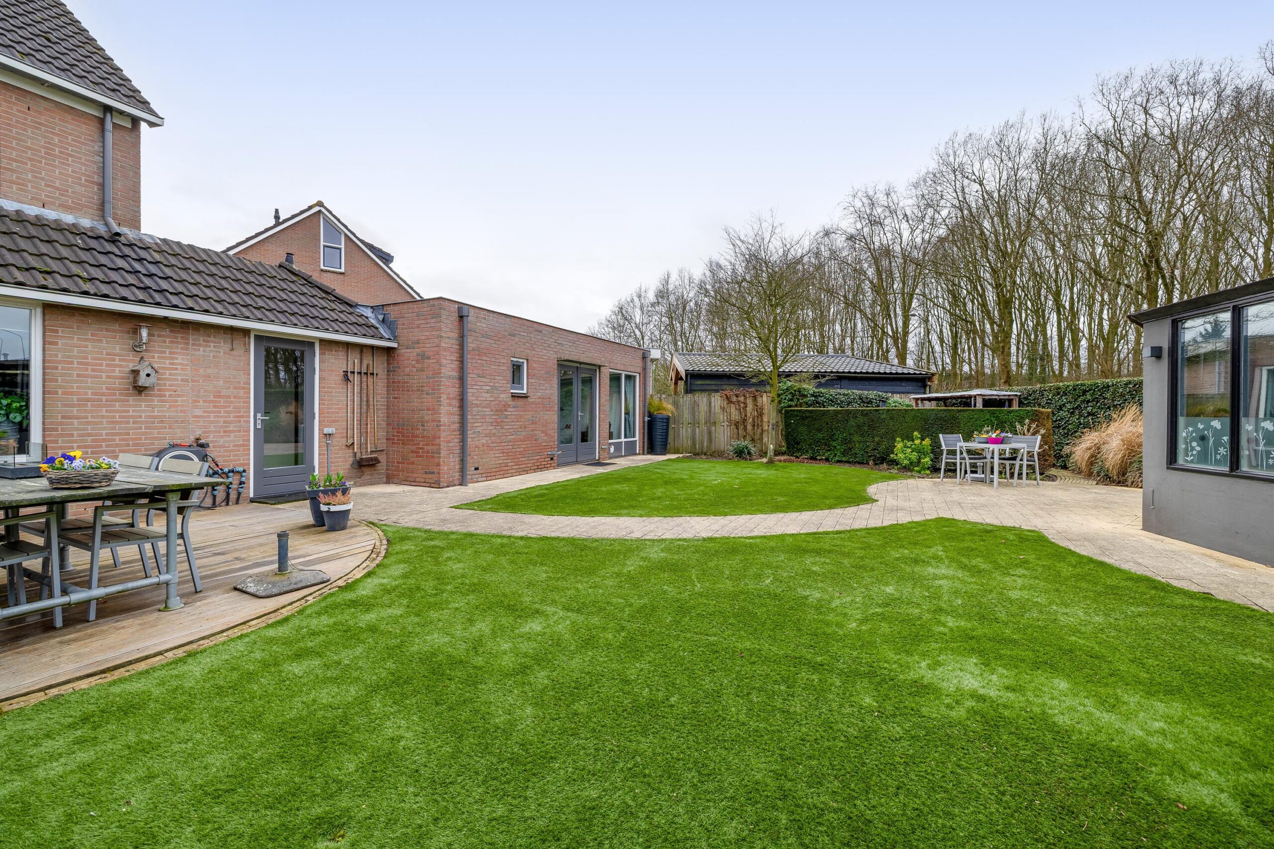 De voortuin is functioneel ingericht met dubbele oprit en is voorzien van een laadpaal. De grote onderhoudsarme achtertuin is ontworpen en onderhouden door een hovenier, met diverse terrassen en gelegen op het noordwesten. Met deze afmetingen heb je altijd wel ergens een plekje in de zon en kijk je prachtig weg richting de bomen. Ook is er een achteruitgang waarmee je meteen toegang hebt tot de straat. In de tuin bevindt zich nog een stenen berging van 16 m² die deels is geïsoleerd en voorzien van elektra. In de tuin kunnen heerlijke zomerdagen worden beleefd in de zon of in de schaduw.