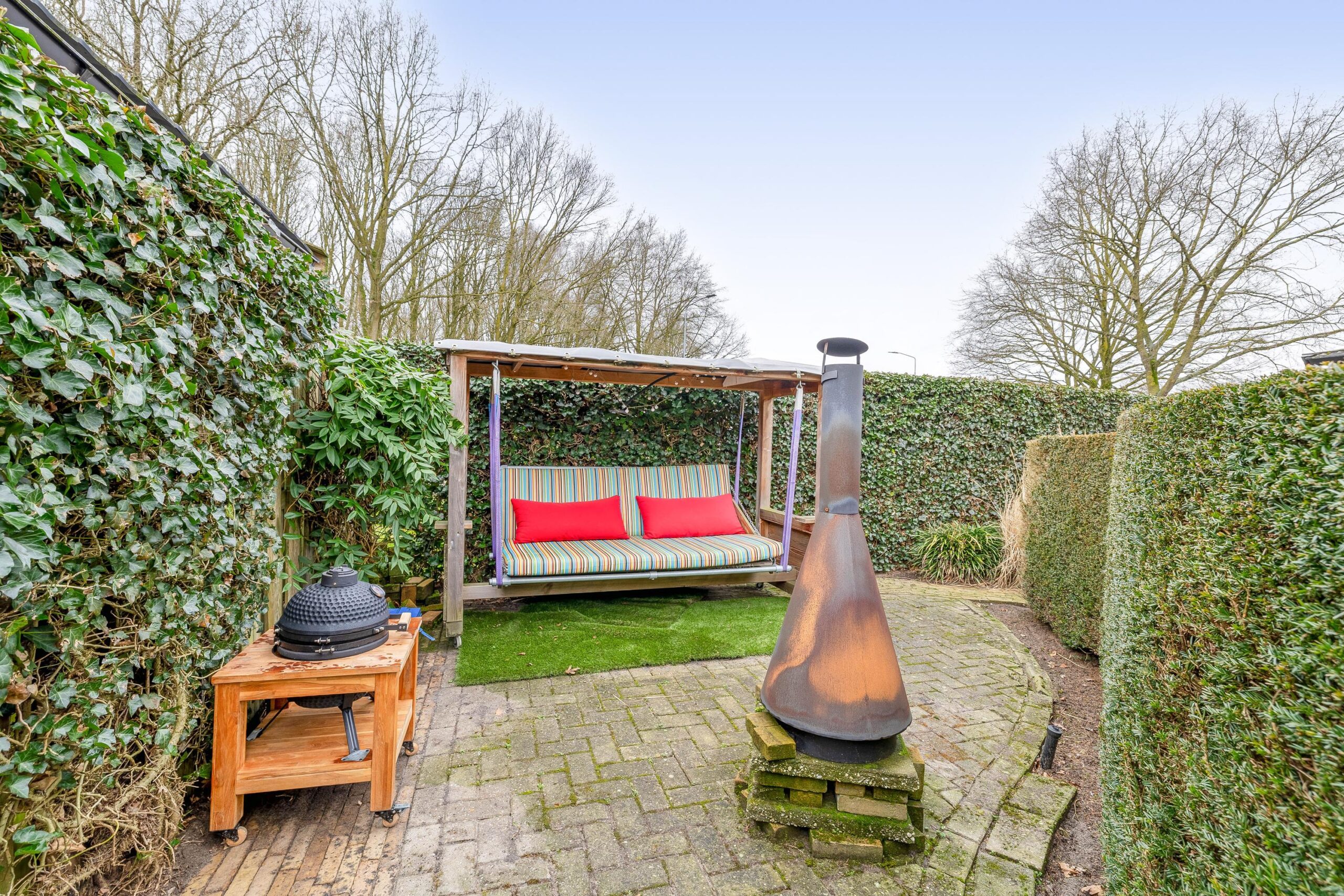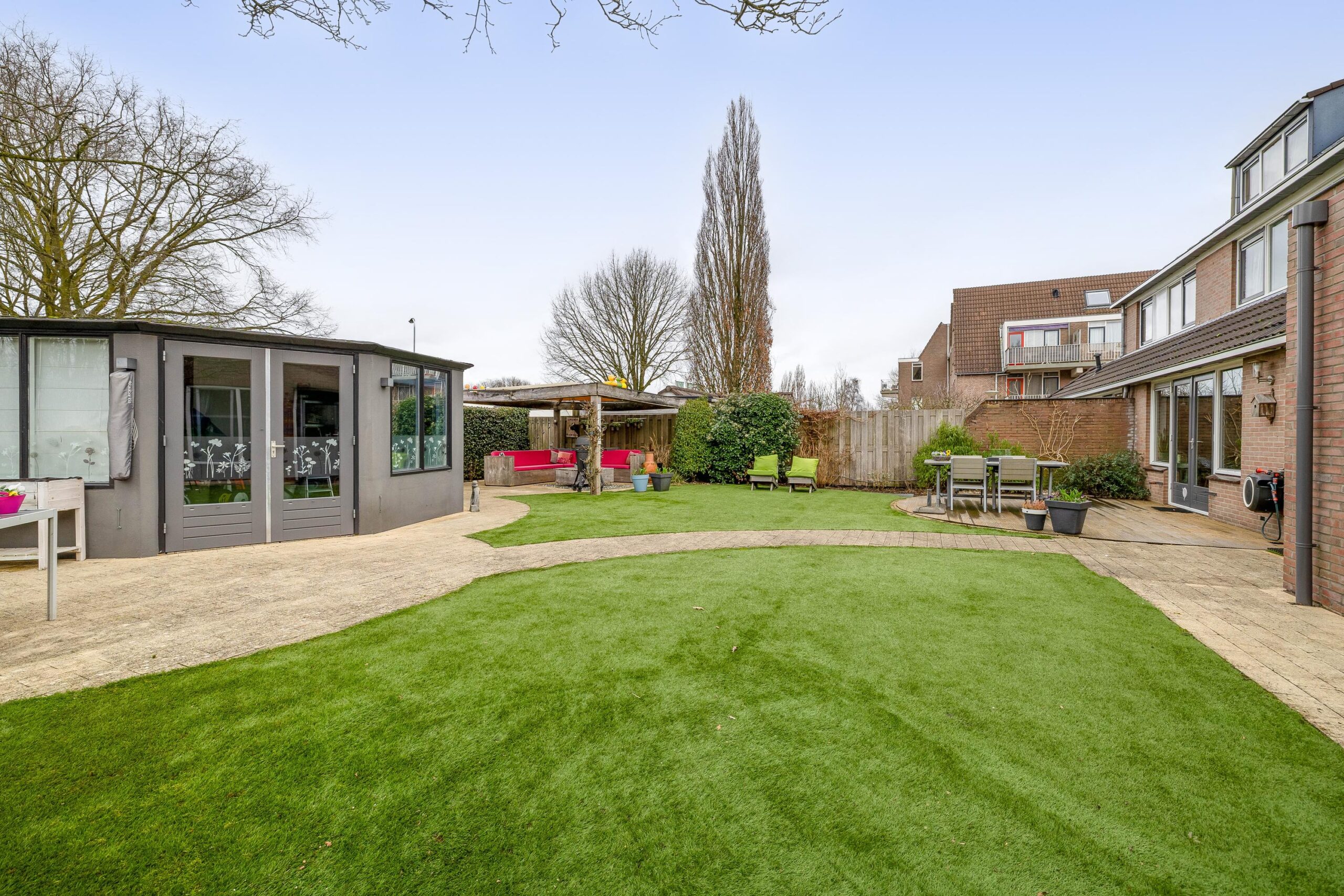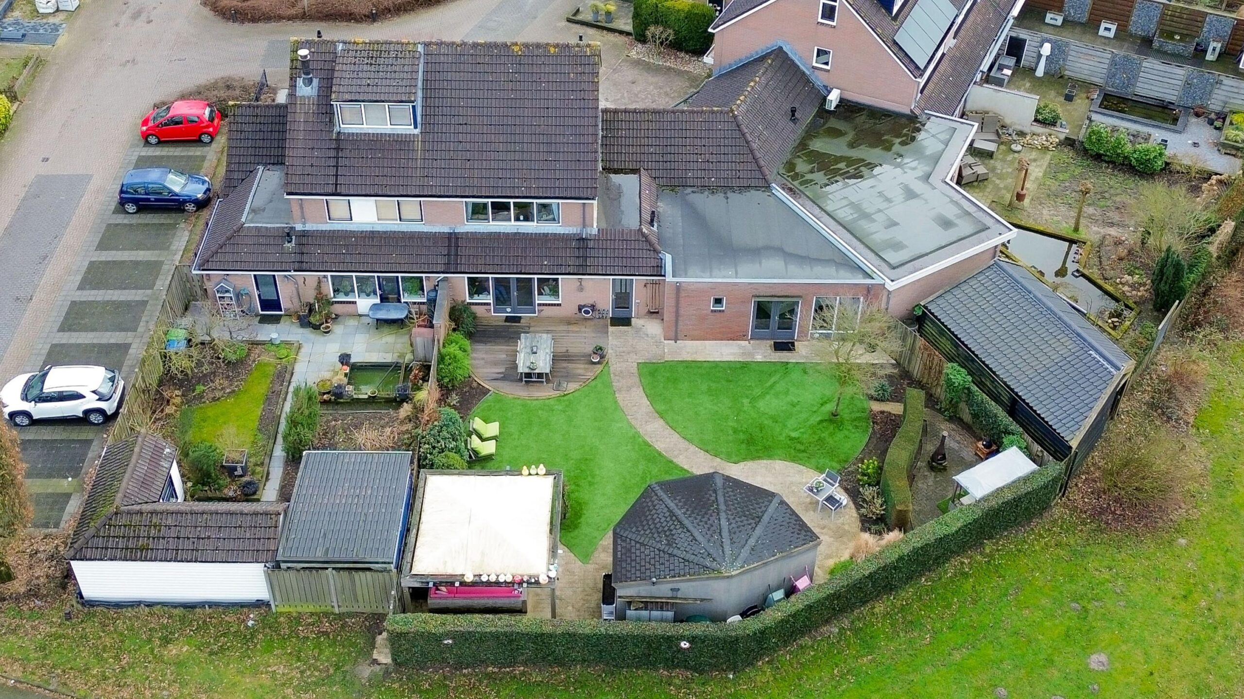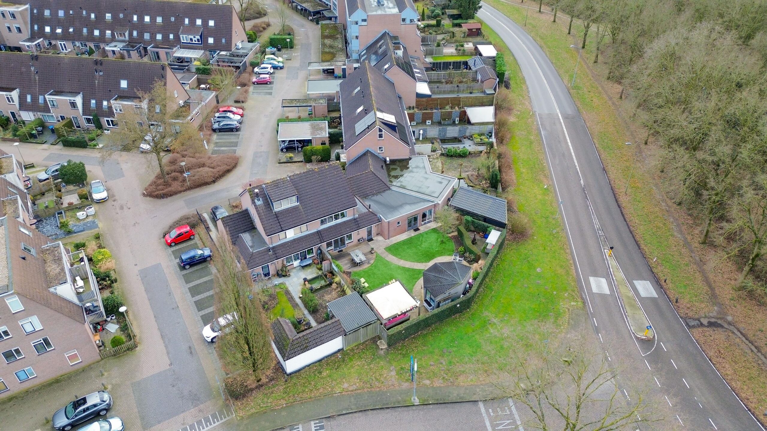De voortuin is functioneel ingericht met dubbele oprit en is voorzien van een laadpaal. De grote onderhoudsarme achtertuin is ontworpen en onderhouden door een hovenier, met diverse terrassen en gelegen op het noordwesten. Met deze afmetingen heb je altijd wel ergens een plekje in de zon en kijk je prachtig weg richting de bomen. Ook is er een achteruitgang waarmee je meteen toegang hebt tot de straat. In de tuin bevindt zich nog een stenen berging van 16 m² die deels is geïsoleerd en voorzien van elektra. In de tuin kunnen heerlijke zomerdagen worden beleefd in de zon of in de schaduw.