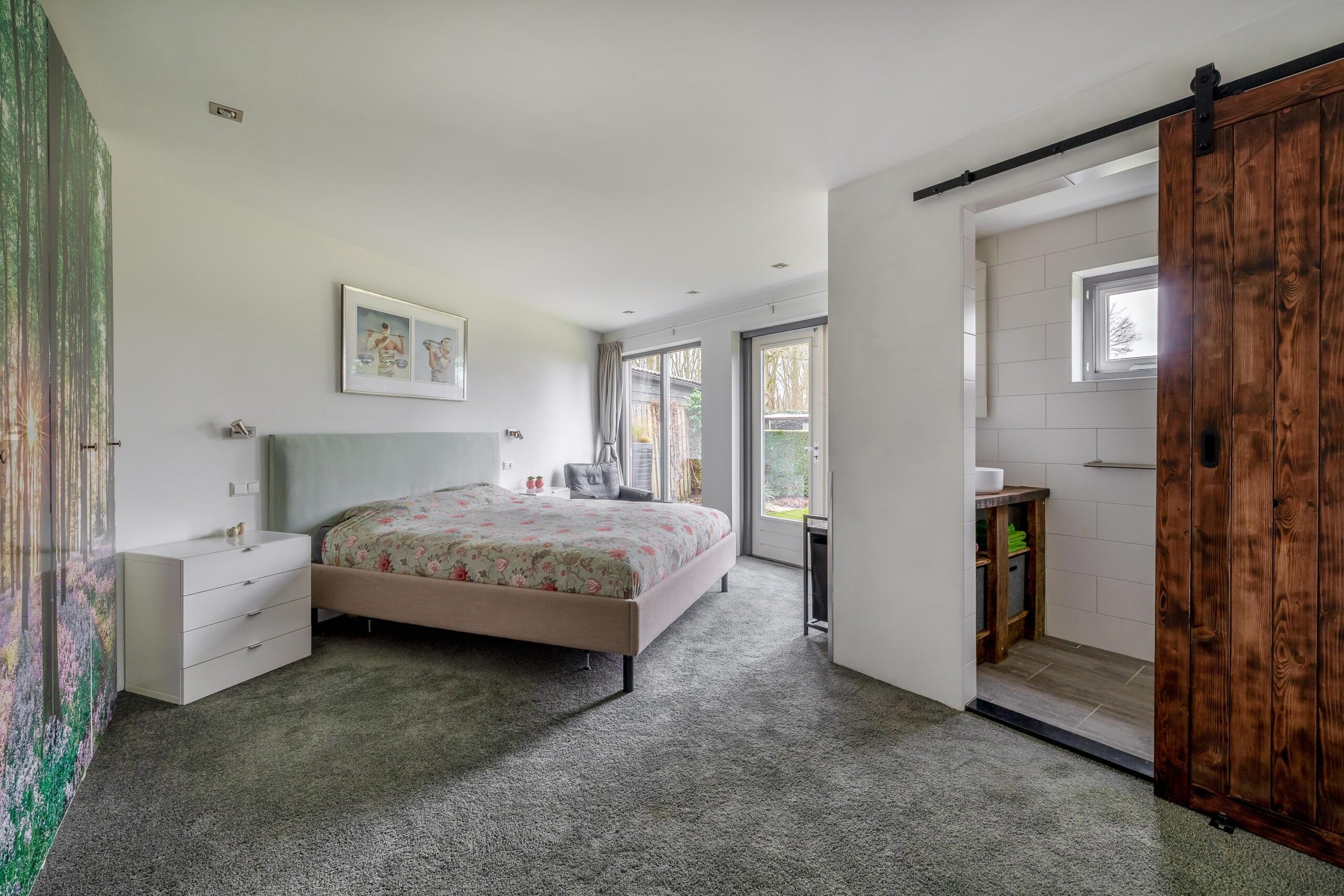 In 2015 is deze woning levensloopbestendig gemaakt. Via een halletje aan de achterkant van de woning loop je direct door naar de zeer ruime slaapkamer, alwaar je door de grote ramen en de openslaande deuren prachtig zicht hebt op de tuin en de omliggende bomen. De slaapkamer is voorzien van vloerverwarming en een badkamer-en-suite voorzien van een robuust wastafelmeubel en inloopdouche. De slaapkamer en badkamer hebben een eigen cv-ketel.