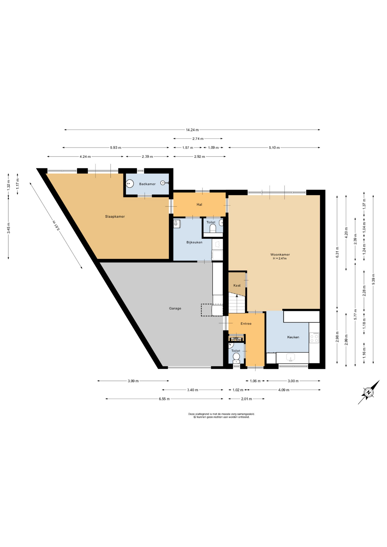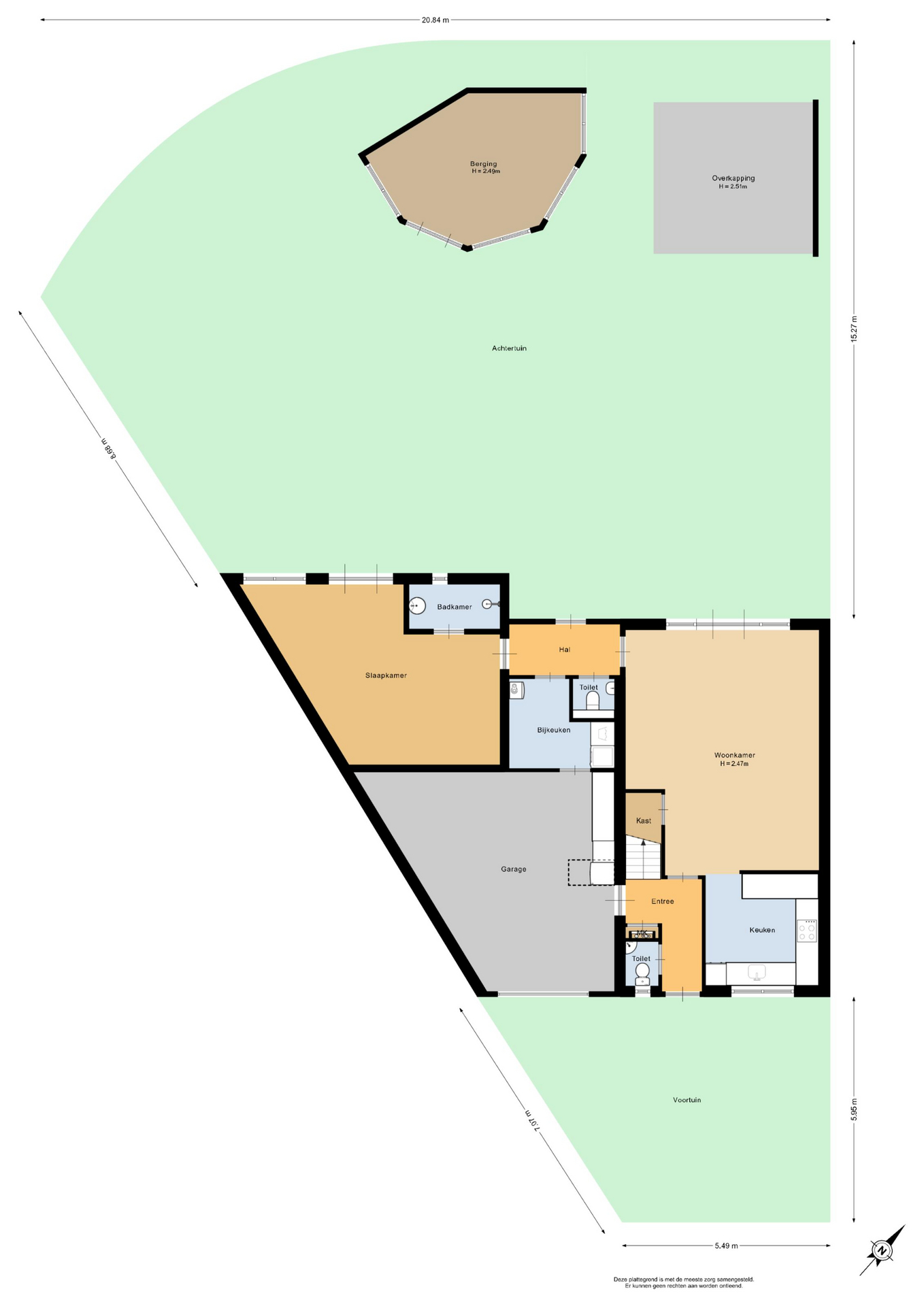 Begane grond: Entree, meterkast, toilet, open keuken, trapkast, woonkamer, tochtportaal, 2e toilet, slaapkamer met badkamer-en-suite, bijkeuken, garage.