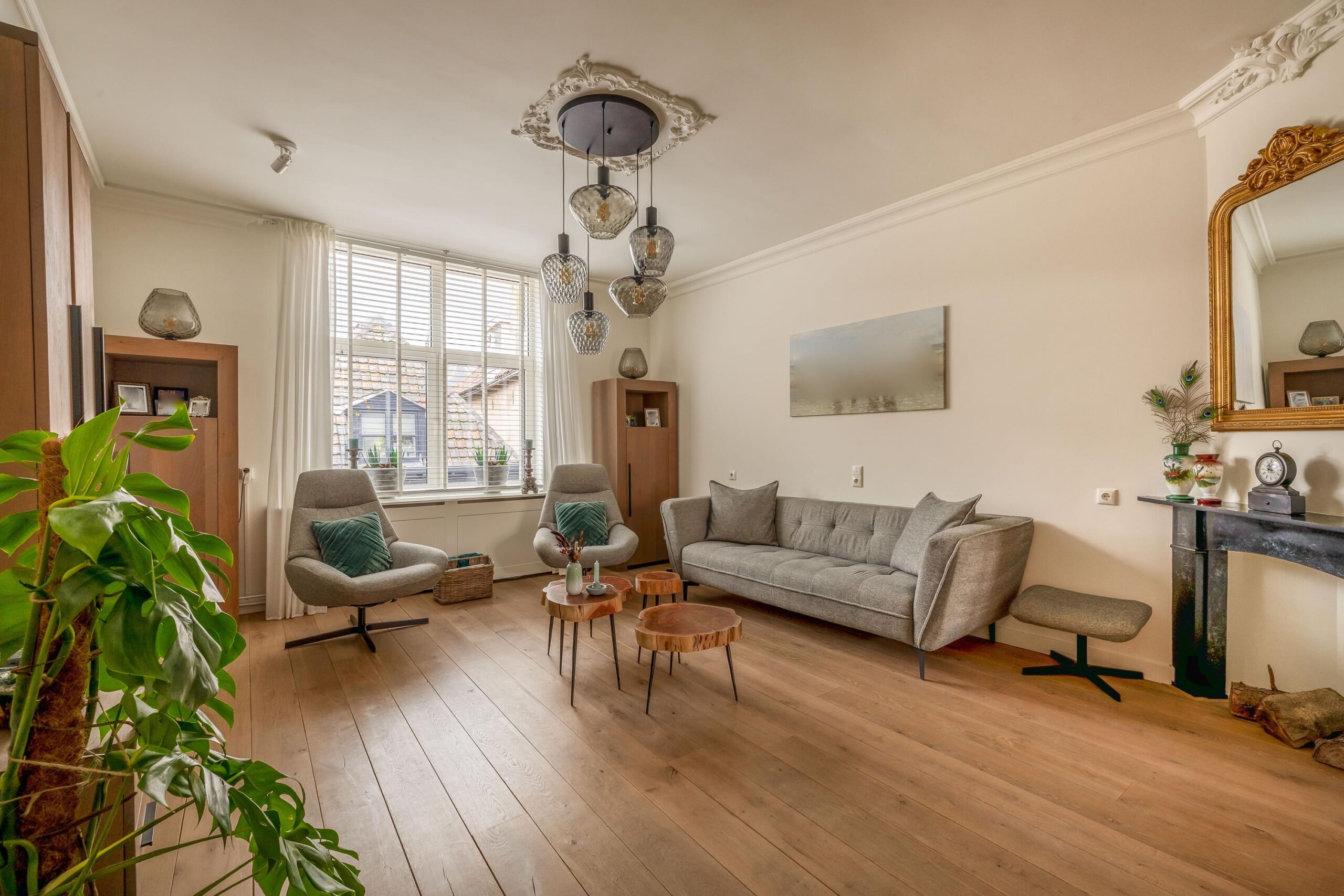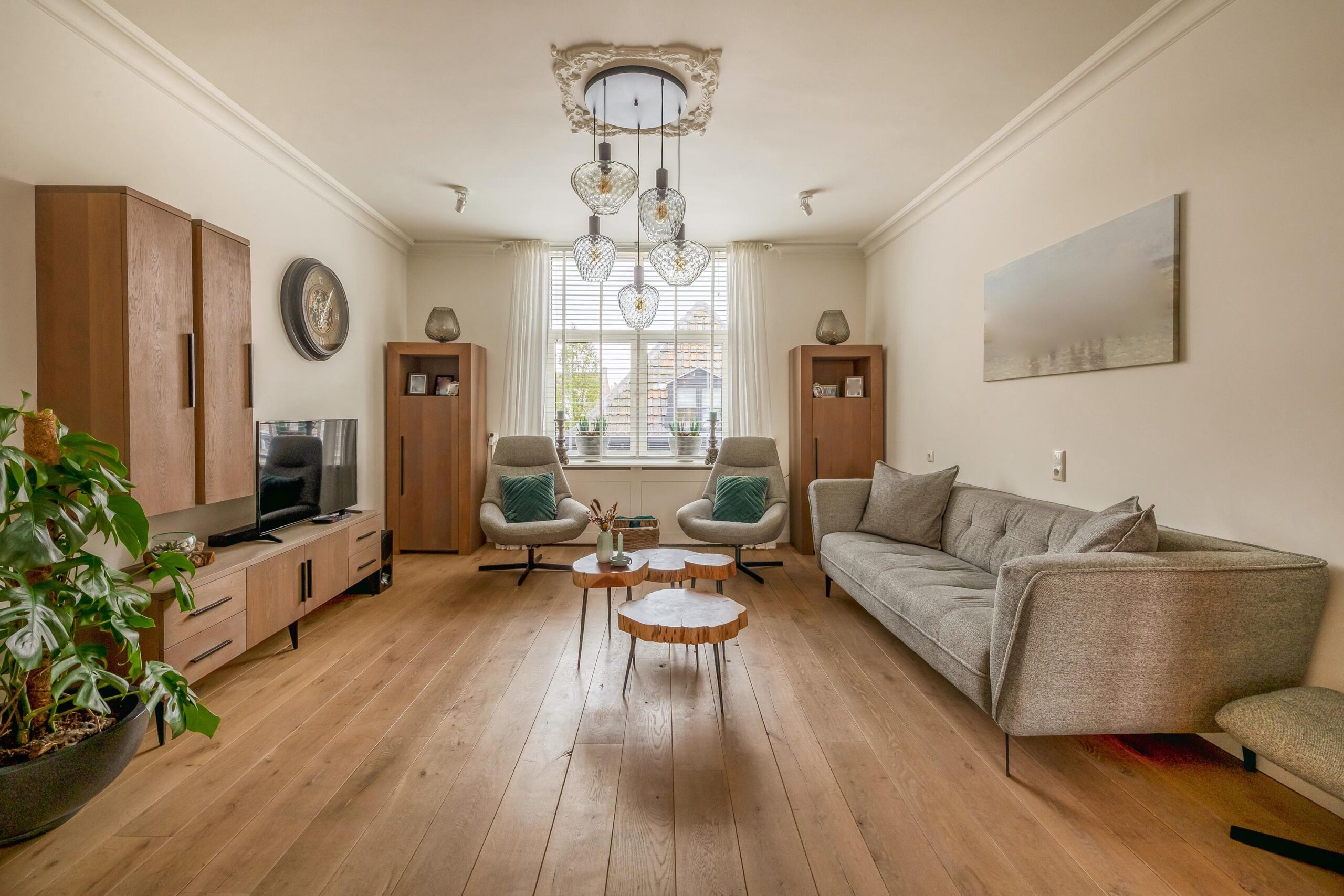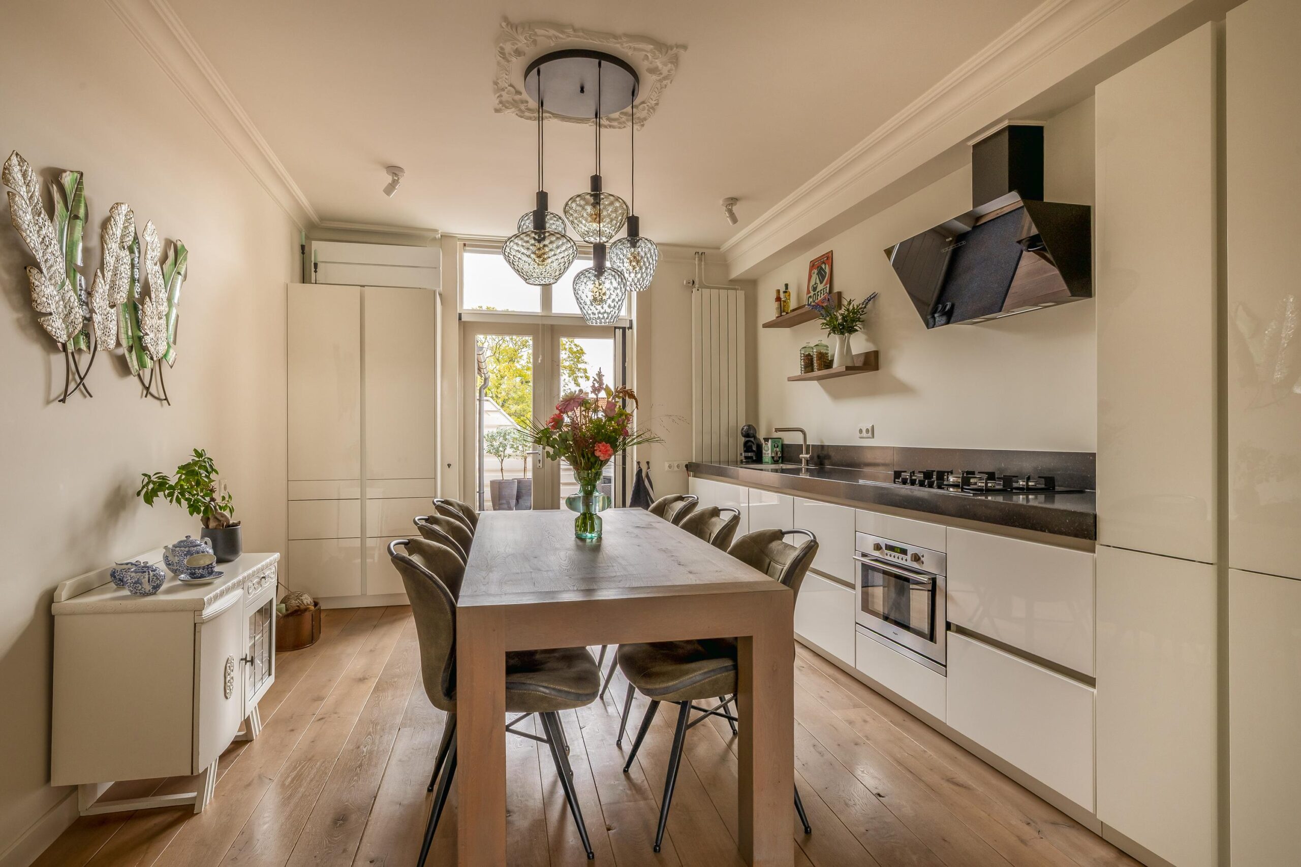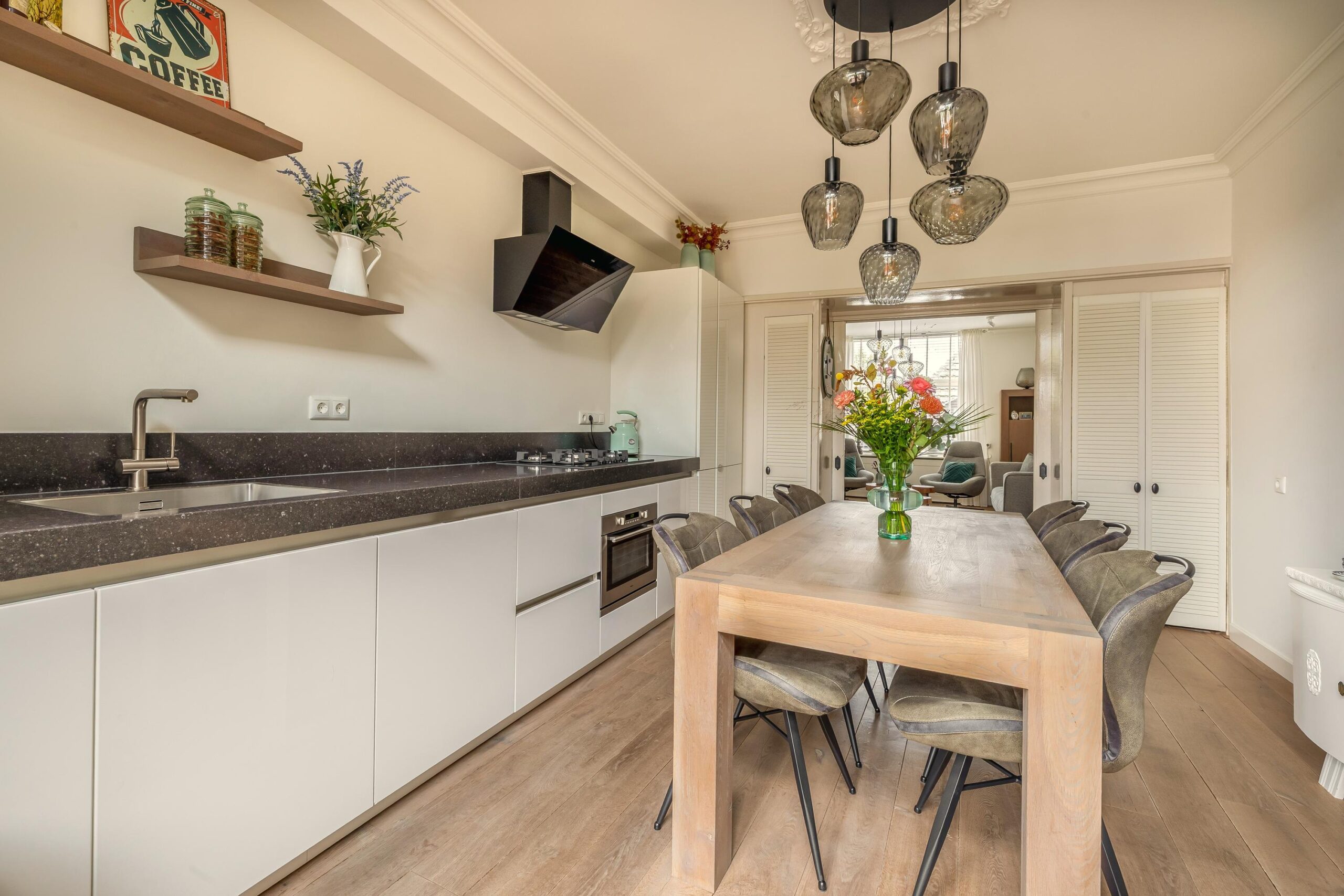 Bij binnenkomst in de ruime woonkamer vallen direct de hoge plafonds met sierlijsten en ornamenten, de originele schouw en de prachtige eikenhouten vloer op. Dankzij de grote raampartijen komt er veel natuurlijk daglicht binnen. De originele glas-in-lood ensuitedeuren vormen een stijlvolle scheiding tussen de woonkamer en de ruim opgezette woonkeuken. De in hoogglans wit uitgevoerde keuken is uitgerust met allerhande recent geplaatste inbouwapparatuur, een tijdloos natuurstenen blad en heeft openslaande deuren (voorzien van een hor) naar het unieke dakterras met prachtige afmetingen en een totaal oppervlak van 39 m²! Hier is voldoende plek voor een grote eettafel, zodat je met gemak kunt genieten van gezellige diners of borrels en alsnog blijft er een mooi gedeelte over voor een loungegedeelte. Ideaal is de berging op het dakterras die goed van pas komt voor bijvoorbeeld tuinkussens en dergelijke. Verder beschikt het appartement over 2 goed bemeten slaapkamers, waarvan 1 slaapkamer met twee vaste kasten en de badkamer ensuite welke is geplaatst in 2021. De moderne badkamer is uitgerust met een goede inloopdouche (regendouche) en wastafelmeubel. De andere slaapkamer heeft een ruime kastenwand en leent zich perfect als thuiswerkkantoor of als logeerkamer. Het toilet (wandcloset) bevindt zich in de hal en in het appartement zijn diverse bergkasten gesitueerd. Er is zelfs nog een verborgen ruimte…