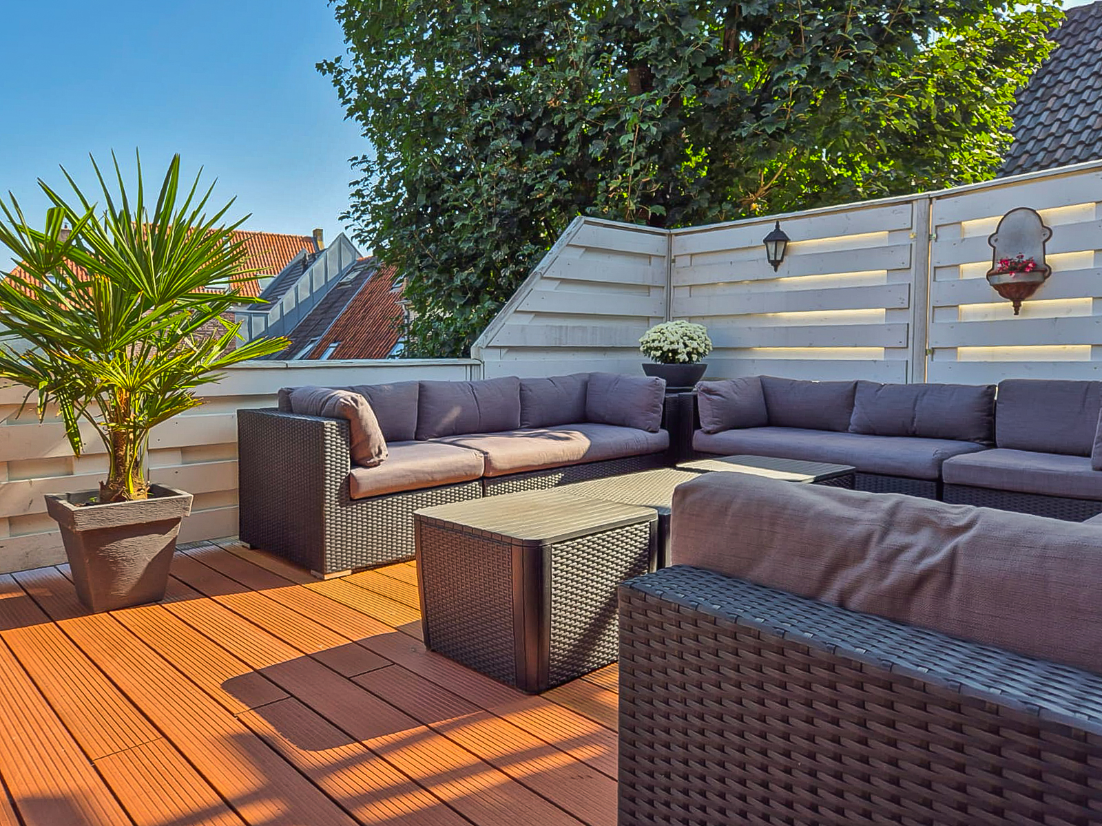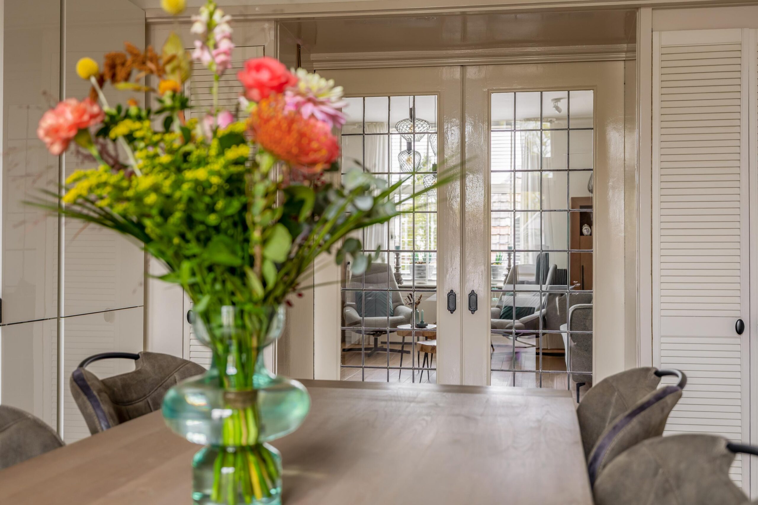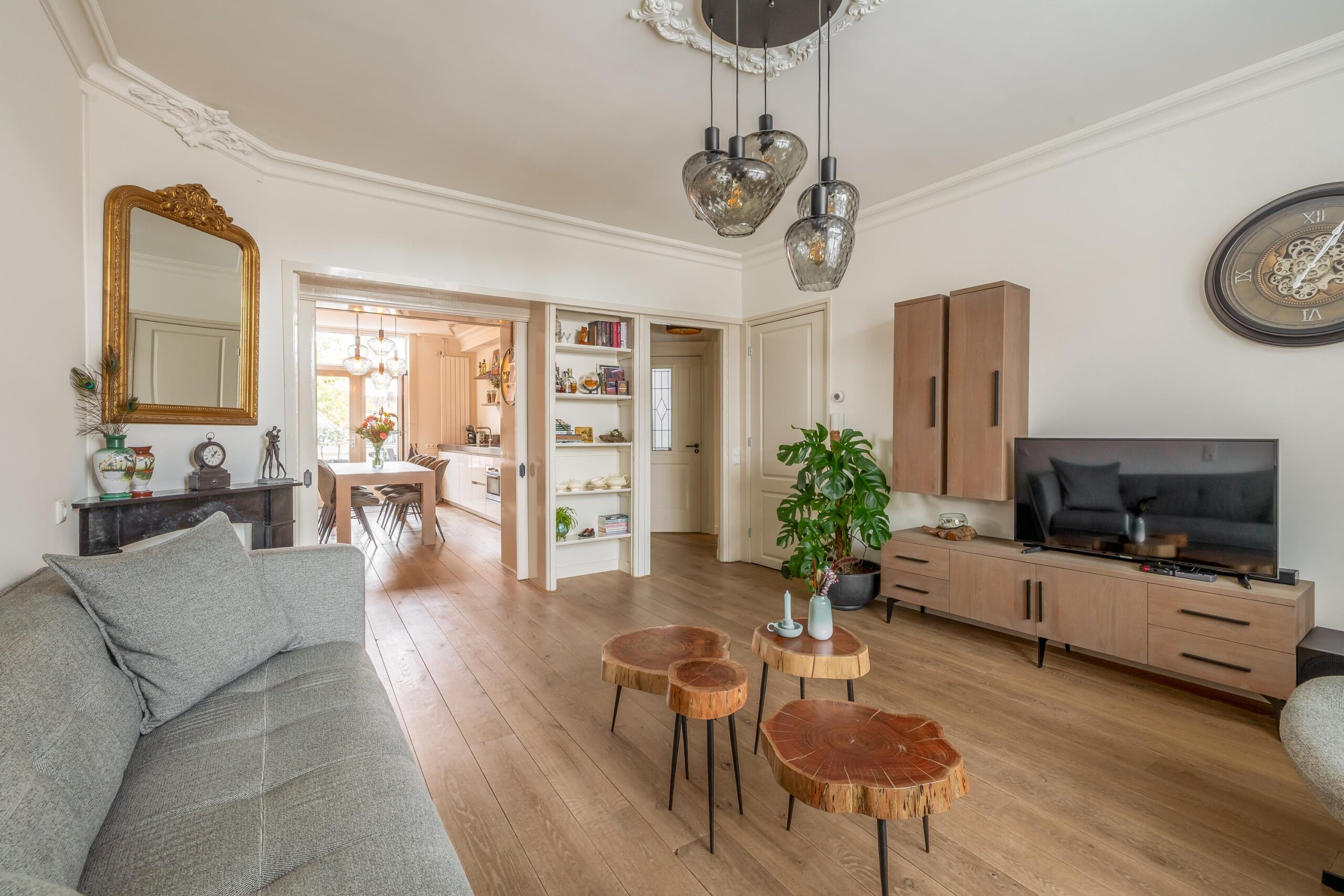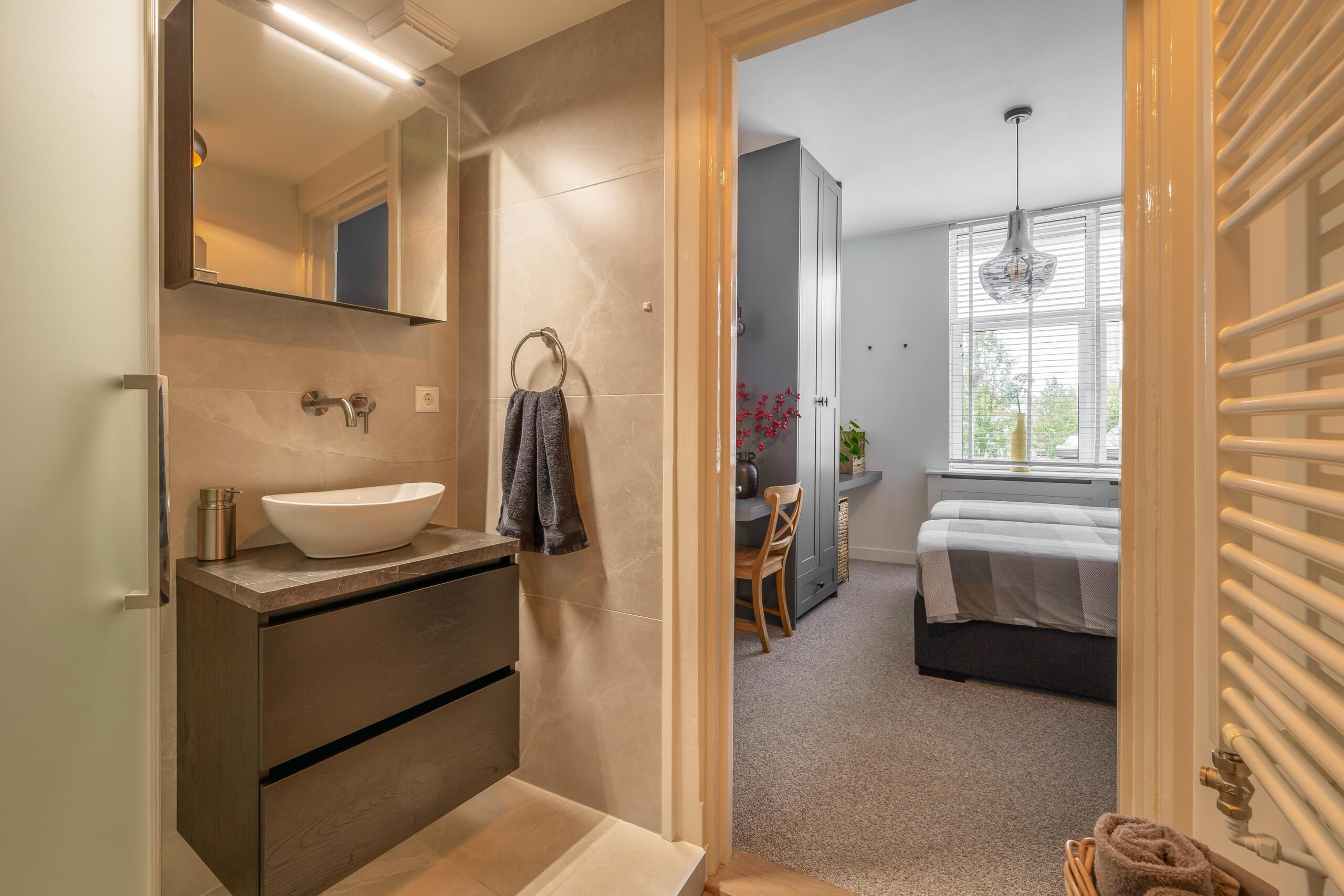 Bij binnenkomst in de ruime woonkamer vallen direct de hoge plafonds met sierlijsten en ornamenten, de originele schouw en de prachtige eikenhouten vloer op. Dankzij de grote raampartijen komt er veel natuurlijk daglicht binnen. De originele glas-in-lood ensuitedeuren vormen een stijlvolle scheiding tussen de woonkamer en de ruim opgezette woonkeuken. De in hoogglans wit uitgevoerde keuken is uitgerust met allerhande recent geplaatste inbouwapparatuur, een tijdloos natuurstenen blad en heeft openslaande deuren (voorzien van een hor) naar het unieke dakterras met prachtige afmetingen en een totaal oppervlak van 39 m²! Hier is voldoende plek voor een grote eettafel, zodat je met gemak kunt genieten van gezellige diners of borrels en alsnog blijft er een mooi gedeelte over voor een loungegedeelte. Ideaal is de berging op het dakterras die goed van pas komt voor bijvoorbeeld tuinkussens en dergelijke. Verder beschikt het appartement over 2 goed bemeten slaapkamers, waarvan 1 slaapkamer met twee vaste kasten en de badkamer ensuite welke is geplaatst in 2021. De moderne badkamer is uitgerust met een goede inloopdouche (regendouche) en wastafelmeubel. De andere slaapkamer heeft een ruime kastenwand en leent zich perfect als thuiswerkkantoor of als logeerkamer. Het toilet (wandcloset) bevindt zich in de hal en in het appartement zijn diverse bergkasten gesitueerd. Er is zelfs nog een verborgen ruimte…