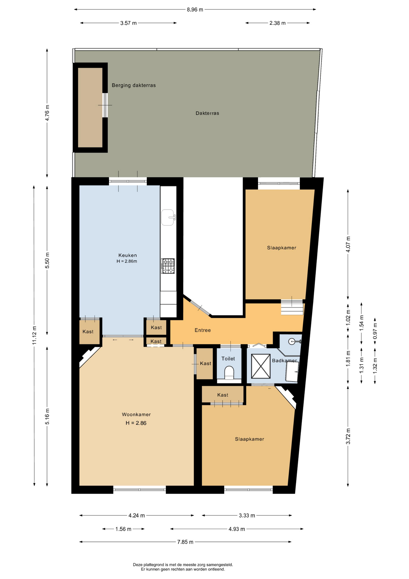 1e Verdieping: Hal, kelder, toilet, garderobegedeelte, woonkamer, woonkeuken, dakterras, badkamer, 2 slaapkamers, diverse bergkasten.