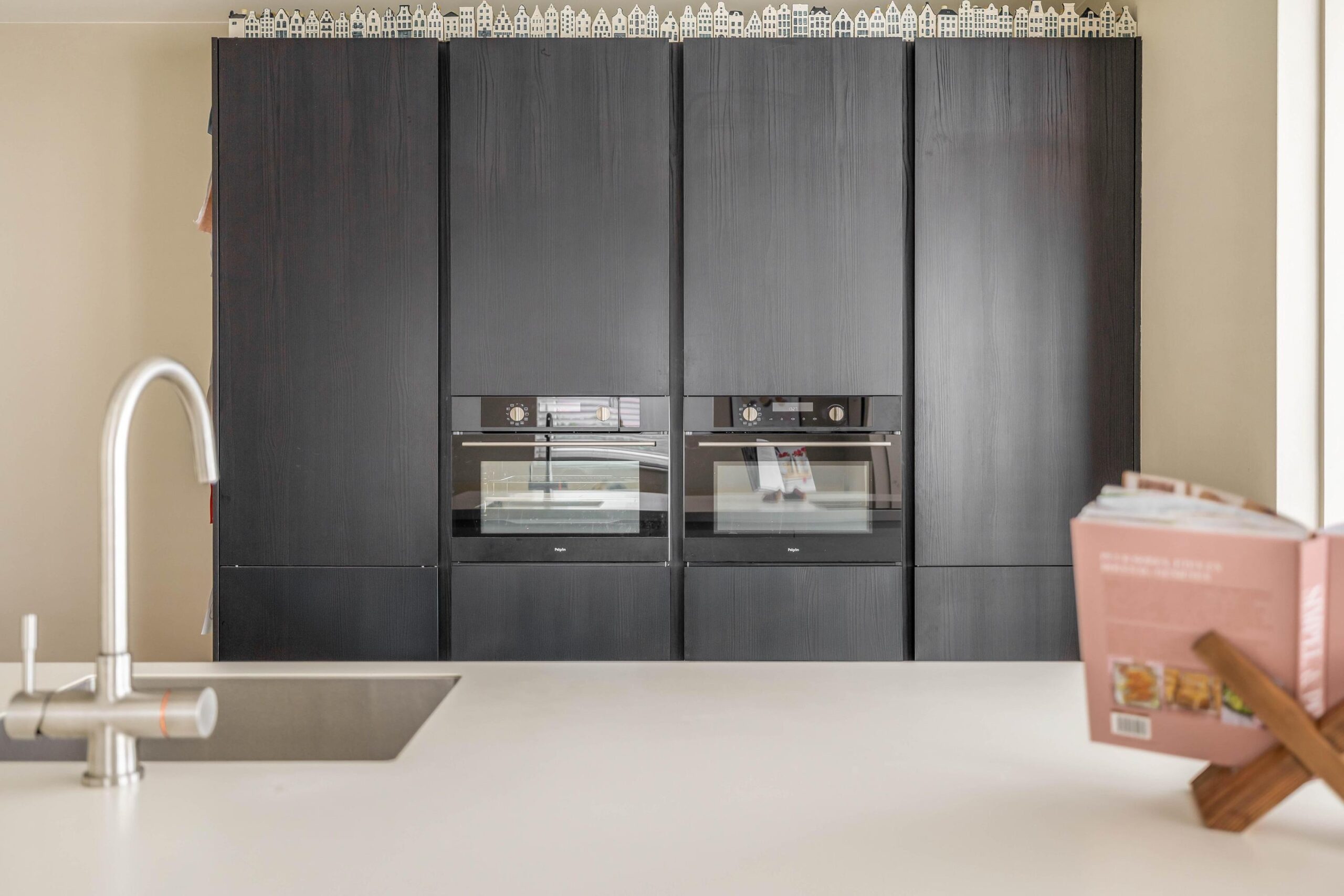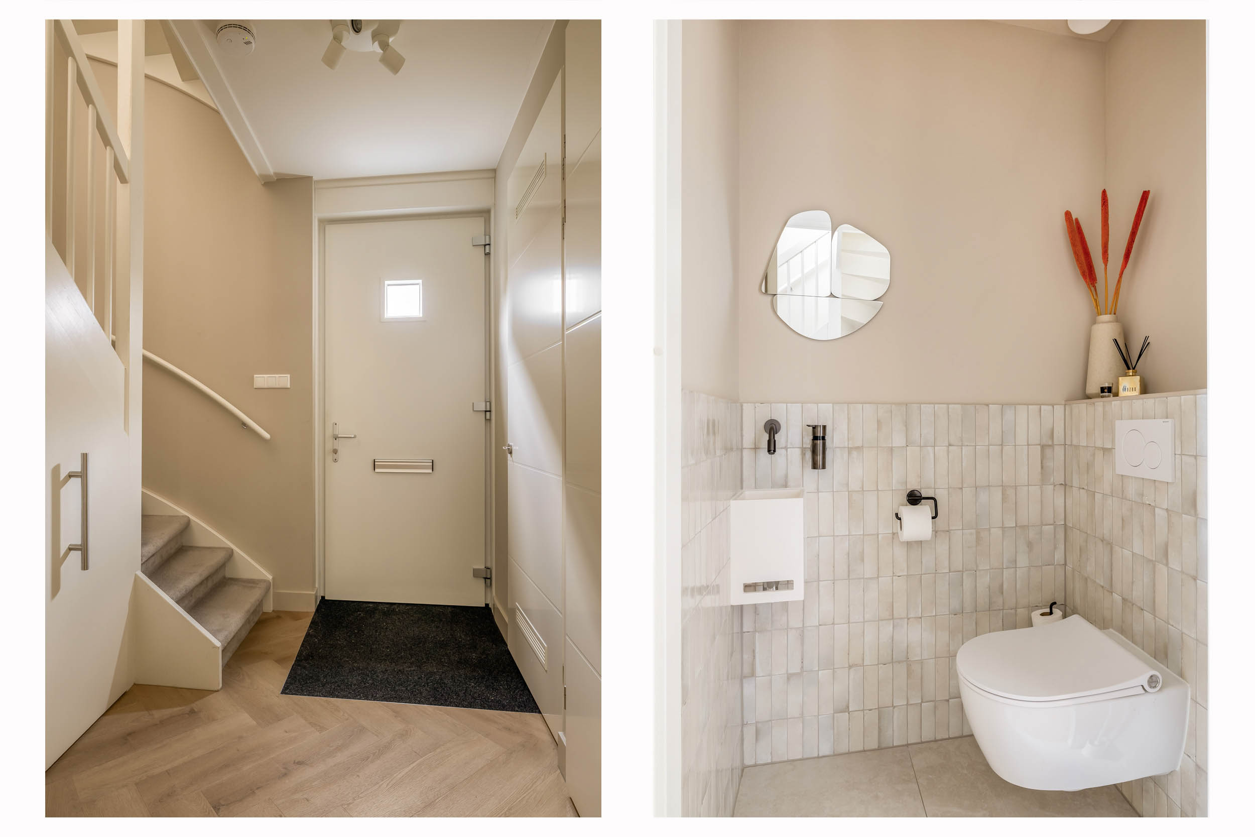 In de hal de meterkast, een handig garderobegedeelte en het toilet (2023) voorzien van een fonteintje. De woonkamer is ruim opgezet en beschikt over een goede zithoek. De eigentijdse open keuken (2019) is straatgericht en voorzien van een kookeiland met kokend waterkraan, inductiekookplaat, weggewerkte afzuigkap in het plafond en vaatwasser. In de hoge kastenwand zit veel bergruimte, een stopcontact voor een koffiezetapparaat, een koel-/vriescombinatie en in het midden zijn een heteluchtoven en stoomoven geplaatst. Speels is de erker en de moderne taatsdeur met de bijbehorende zwarte kleurstelling in deze lichte omgeving zorgt dit voor een speciale ambiance.