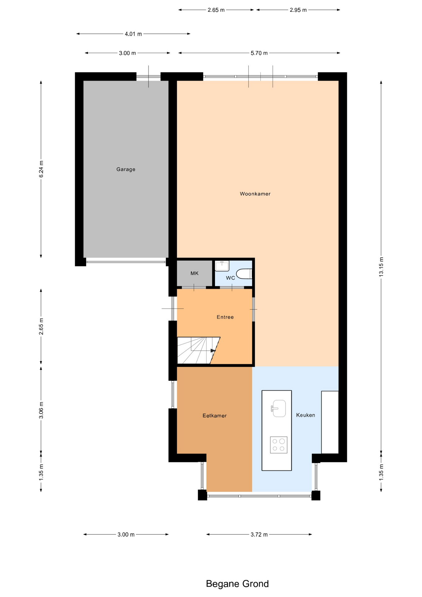 Begane grond: Hal, meterkast, toilet, trapkast, woonkamer met open keuken.