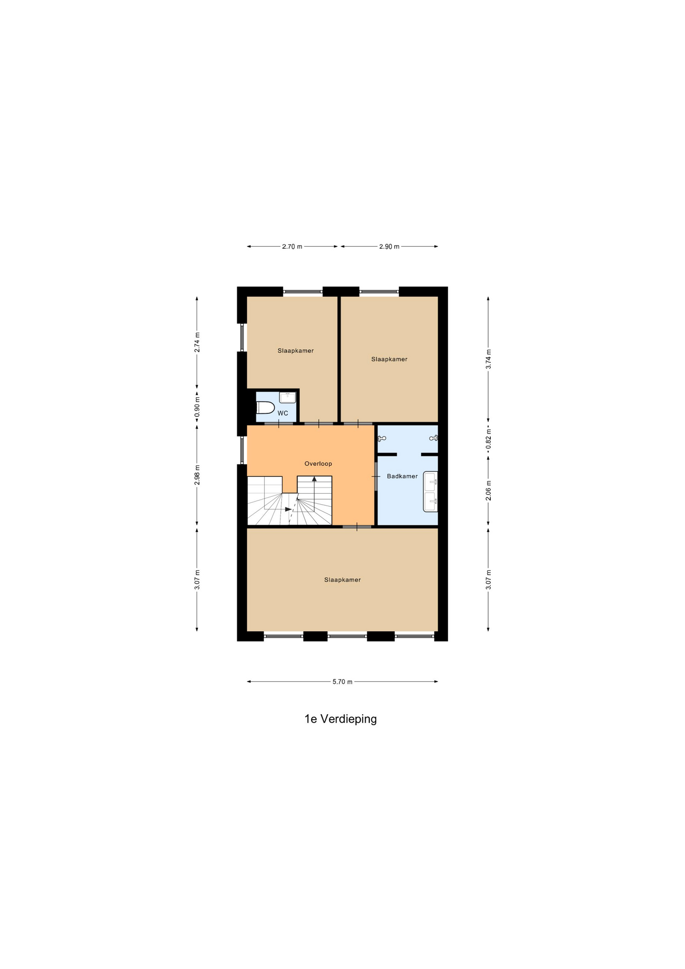 1e Verdieping: Overloop, 3 slaapkamers, badkamer, separaat 2e toilet.