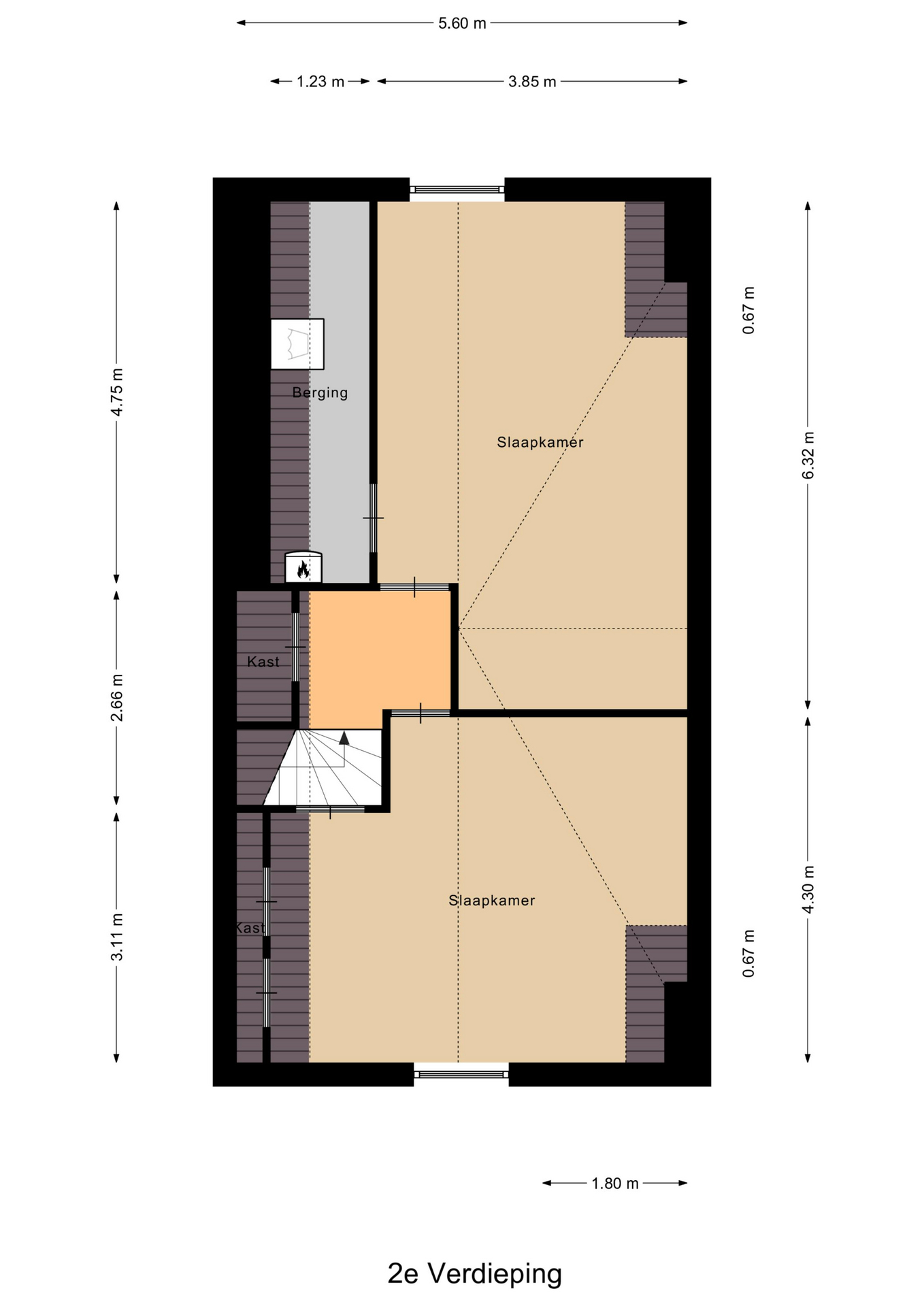 2e Verdieping: Overloop, 2 slaapkamers, stookruimte, bergruimte.