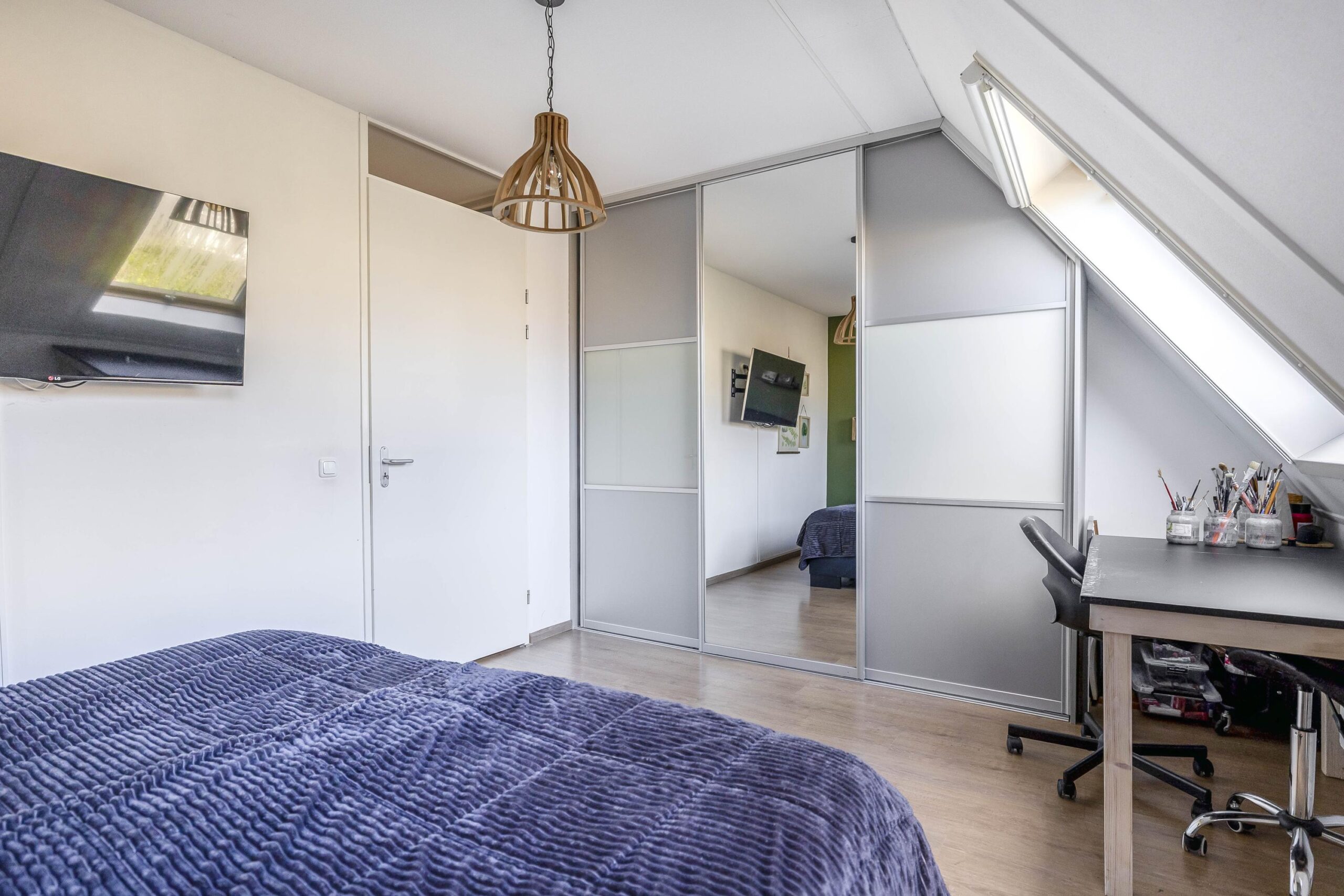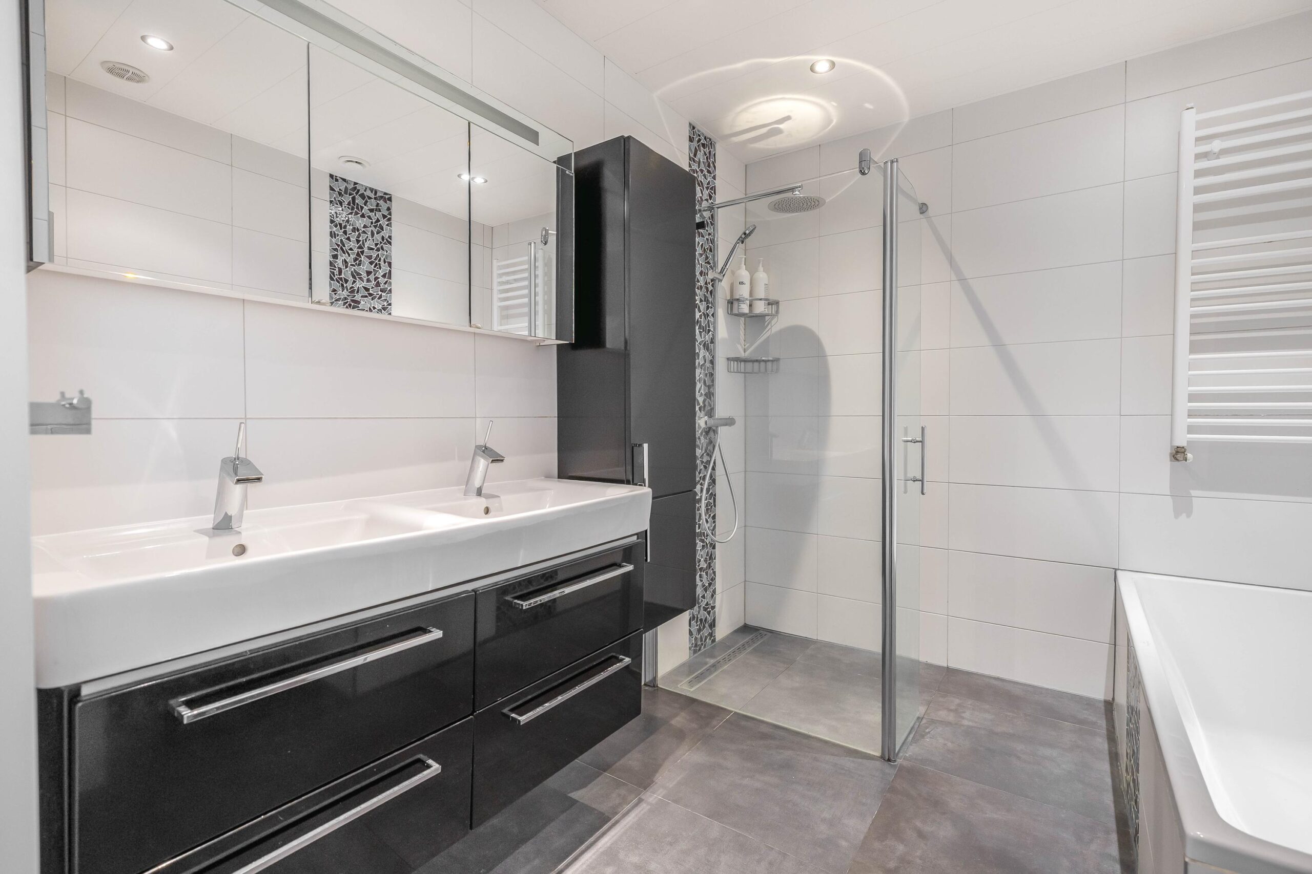 Op de 1e verdieping 2 slaapkamers met mooie afmetingen. De badkamer is van alle gemakken voorzien en compleet. Een dubbel wastafelmeubel met bijpassende meubelkast, ligbad, 2e toilet, een goede inloopdouche en vloerverwarming. De 2e verdieping is opgedeeld in een overloop met stookruimte/wasmachinegedeelte en 3e slaapkamer. Ook is er aan bergruimte gedacht! Dit kan op de 1e en 2e verdieping aan de schuine kant of op de gerealiseerde bergzolder.